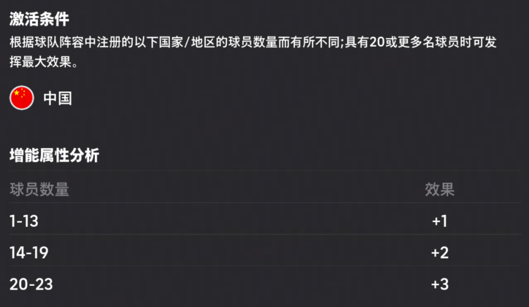 郜林和蒿俊闵均拥有【全面提升】的增能加成,在阵中拥有同国家的球员越多,增能属性越强,最高能够拥有【属性+3】加成。