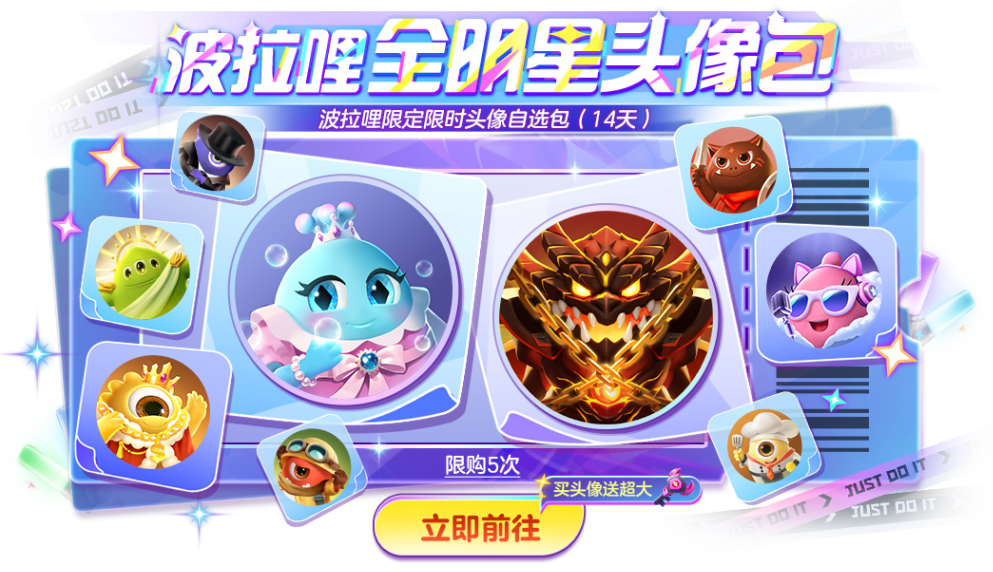 活动内容:全明星头像自选包全新上线,仅需6元即可将波拉哩限定头像和超大揽入怀中,超萌炫酷动态头像-波拉哩六小只和帅气卡奥斯以及小怪兽等你带回家!