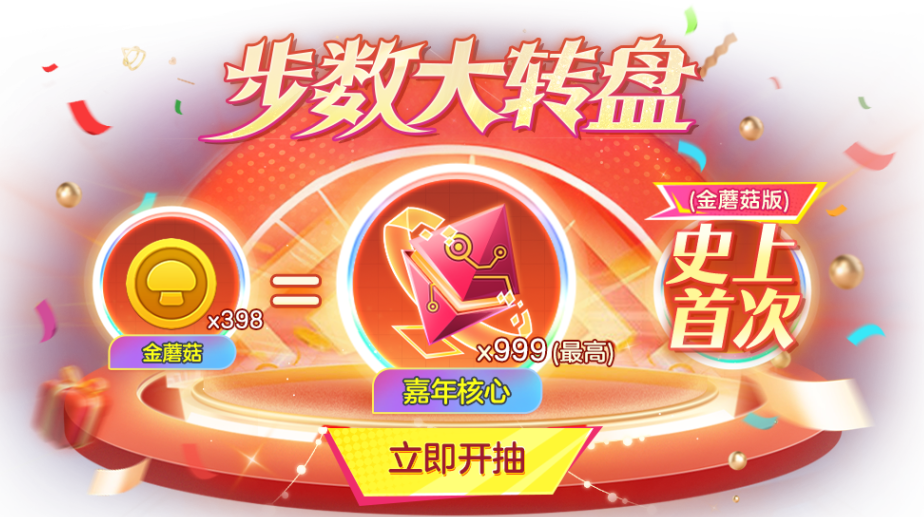 活动内容:史上首次!金蘑菇抽步数限时来袭,可以用金蘑菇抽步数啦!内含嘉年核心×999!助力大家爬塔欧气满满!