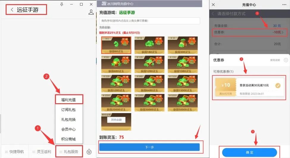 ①点击《远征手游》公众号导航栏中的礼包服务→福利充值;
