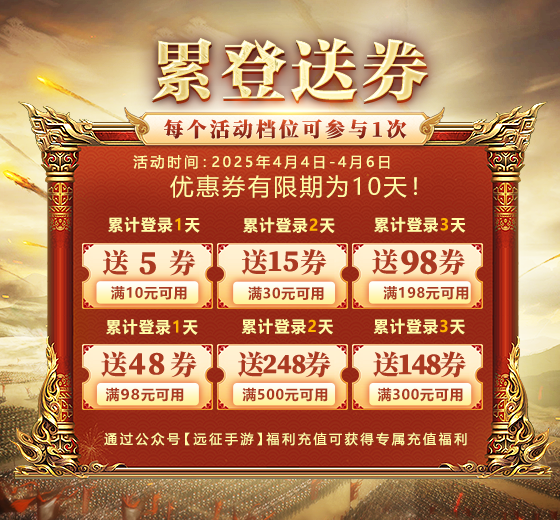 4、充值优惠券将在达成档次的第二天直接发送到角色上,在公众号充值或者游戏内点击充值可直接使用充值优惠券!充值优惠券有效期为15天。