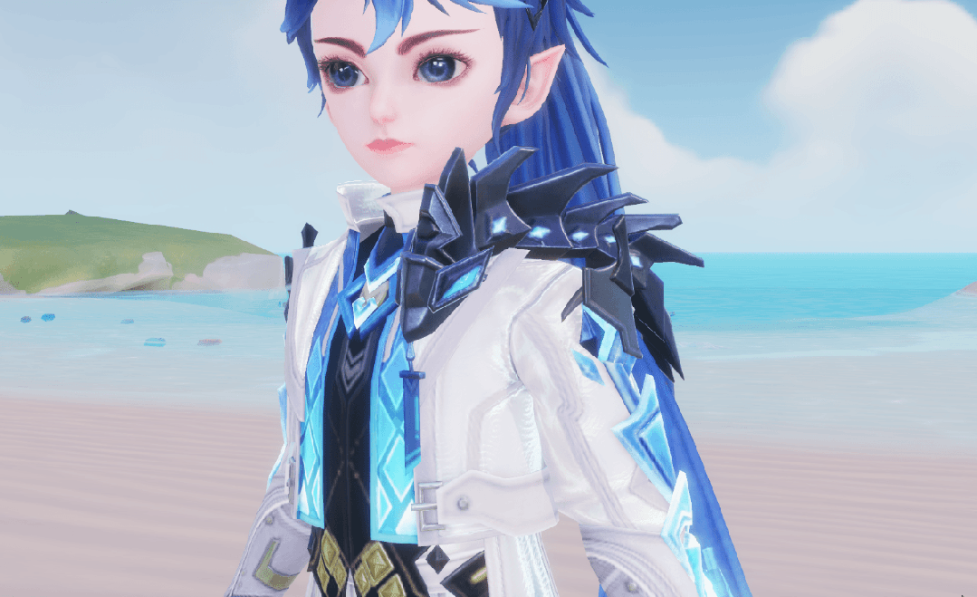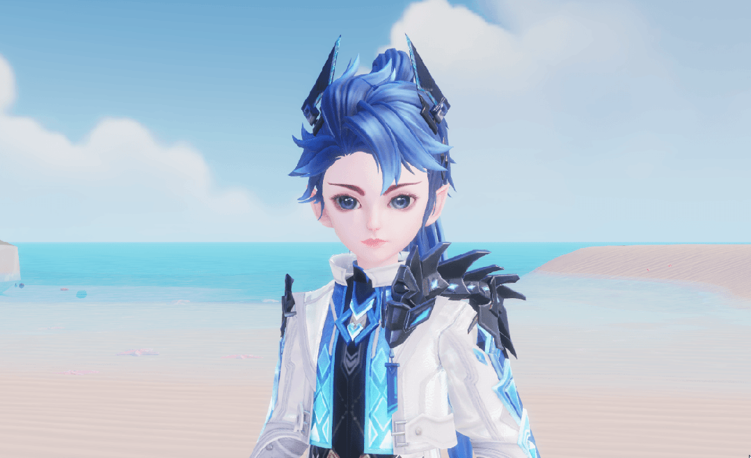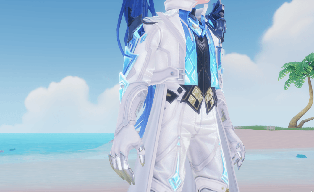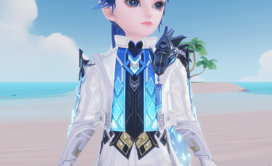 深黑色打底与炫目的蓝色渐变马甲相互映衬,菱型纹路闪烁荧光,银白色外套持重得体,黑金色腰带划出腰身。一条墨蓝小蛇呆在肩头,坚硬的背鳍上镶嵌着青色宝石,眼睛闪烁着夺目光芒。