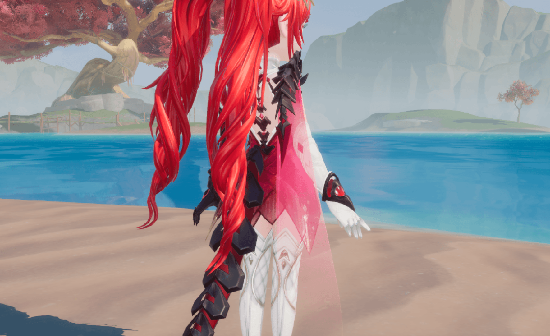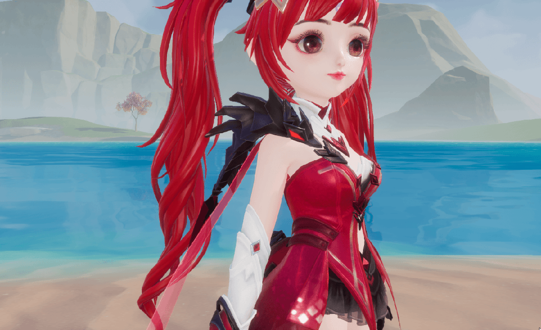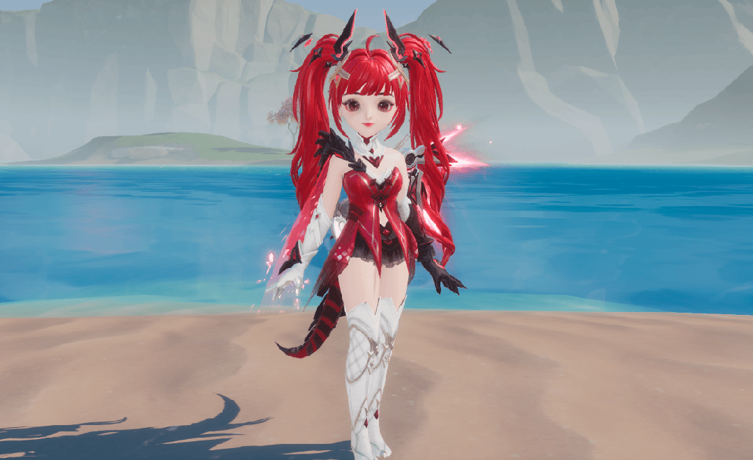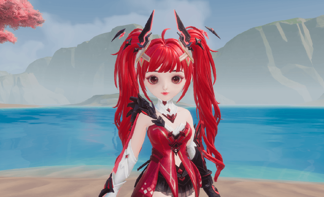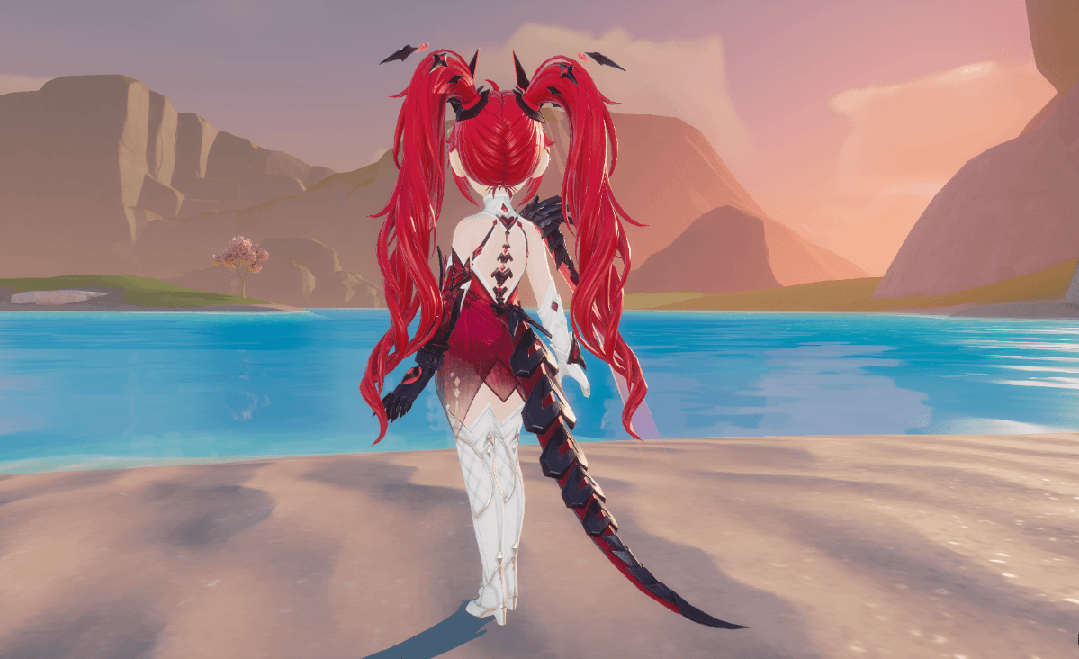 女款【螣云矖雾】一头红发热情似火,齐刘海双马尾十分可爱,卷曲的头发及腰,以金色发夹固定,黑耀石、粉宝石菱型发饰围绕着发端,最突出的粉边黑宝石形似螣蛇的双翼,带着锐利的锋芒。