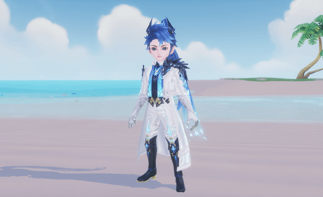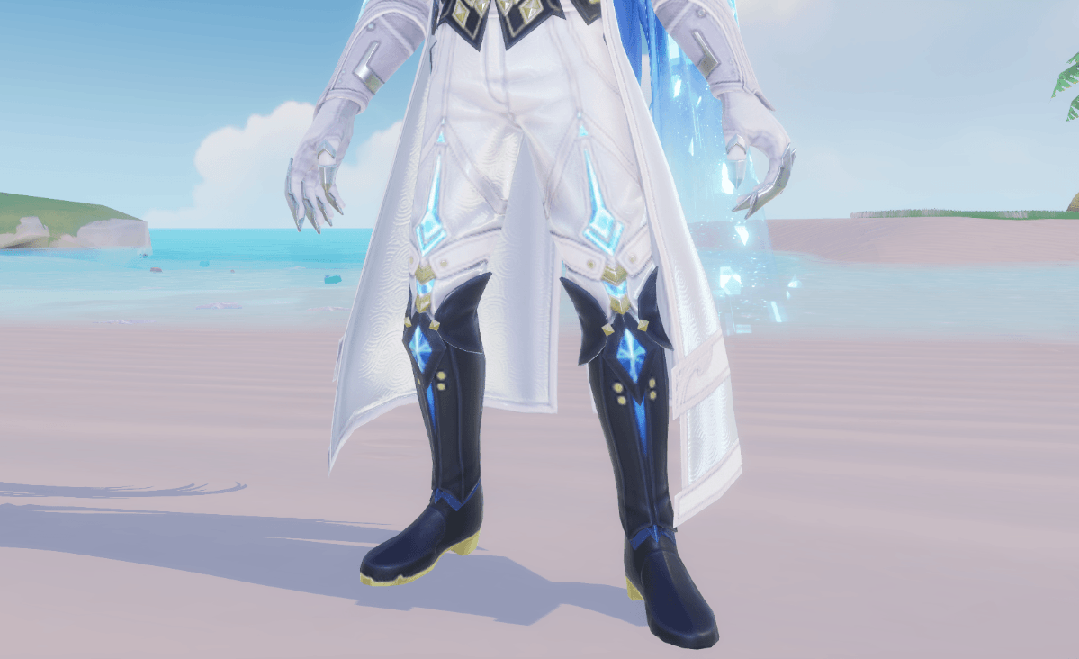 男款【螣云矖雾】身着白色长裤,青蓝色纹路如一条电流轨迹向下探去,宝石闪耀夺目,黑色长靴贴合腿部线条,将长裤收束齐整,十分利落。