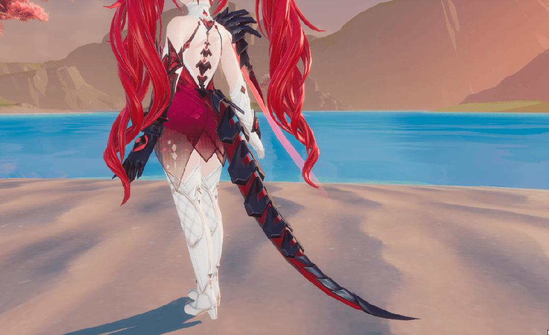 从背面看去,女款【螣云矖雾】脚踩一双白色长筒高跟鞋,金银网状纹路交织,显得十分高挑贵气。一条薄如蝉翼的粉色披风随风飘扬,黑粉色项链紧贴背部,模仿蛇脊。黑红色金属蛇尾在身后微微摆动,看起来坚硬又灵活。