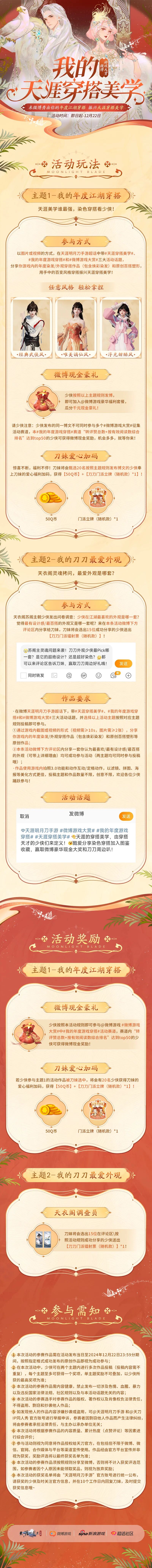 刀妹准备了微博现金激励还有【Q币】和【刀刀周边】送给少侠,只为学习一下少侠的绝美穿搭,即日起-12月22日,刀妹将日日在微博/超话蹲守,少侠请赐教!