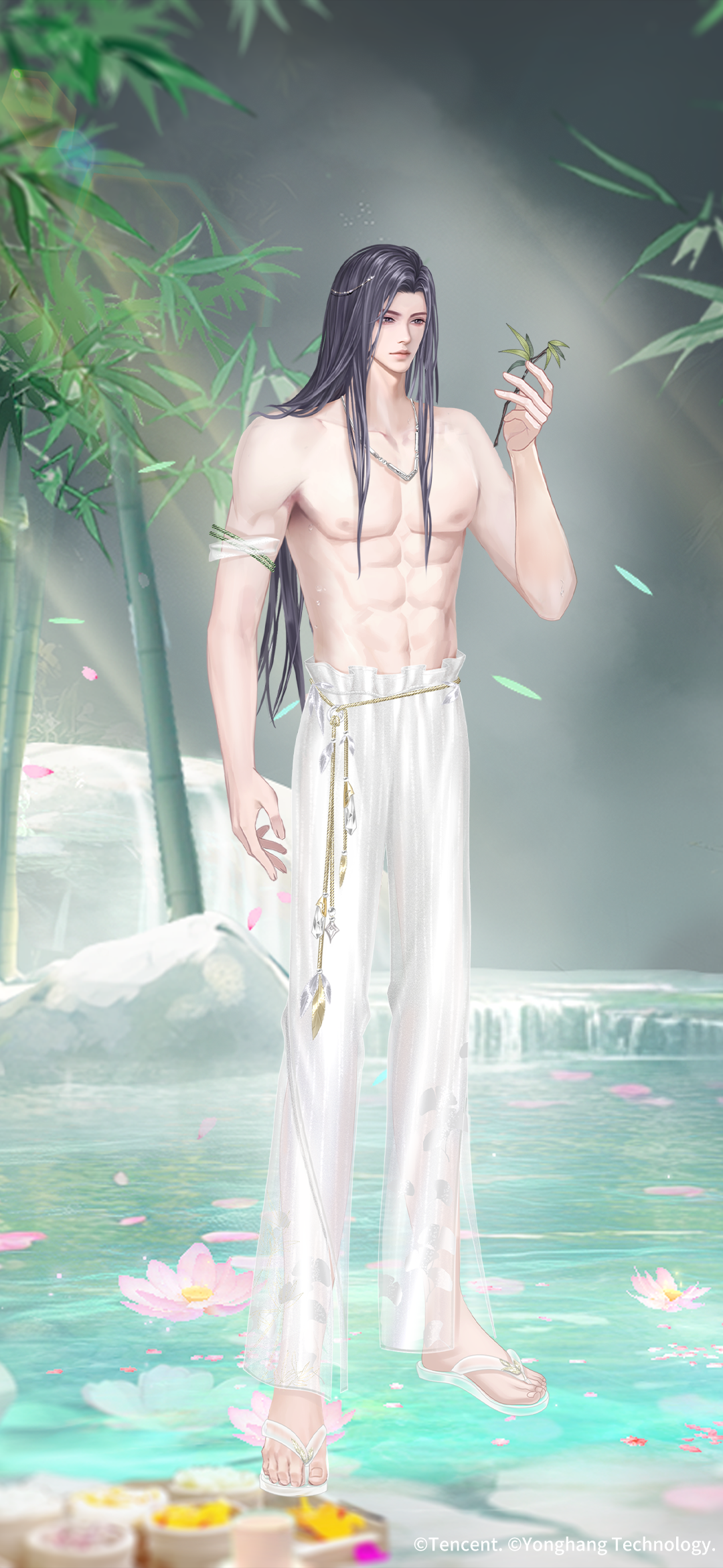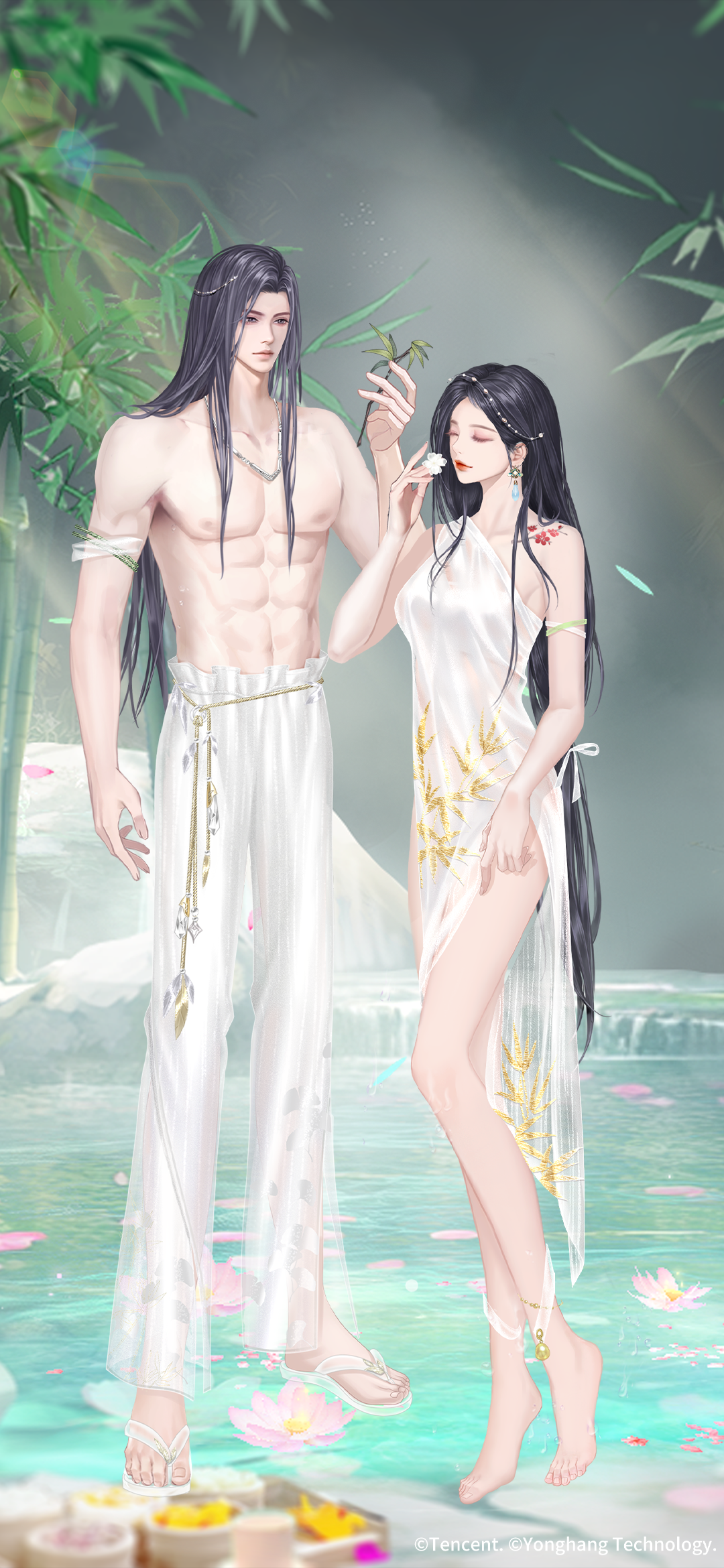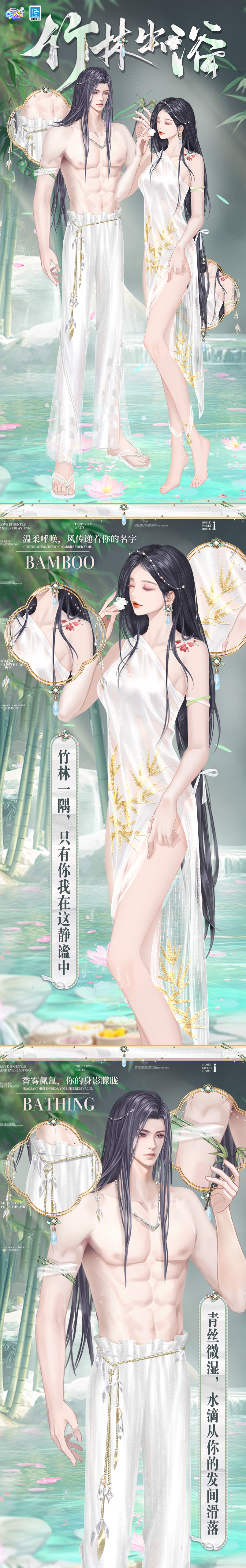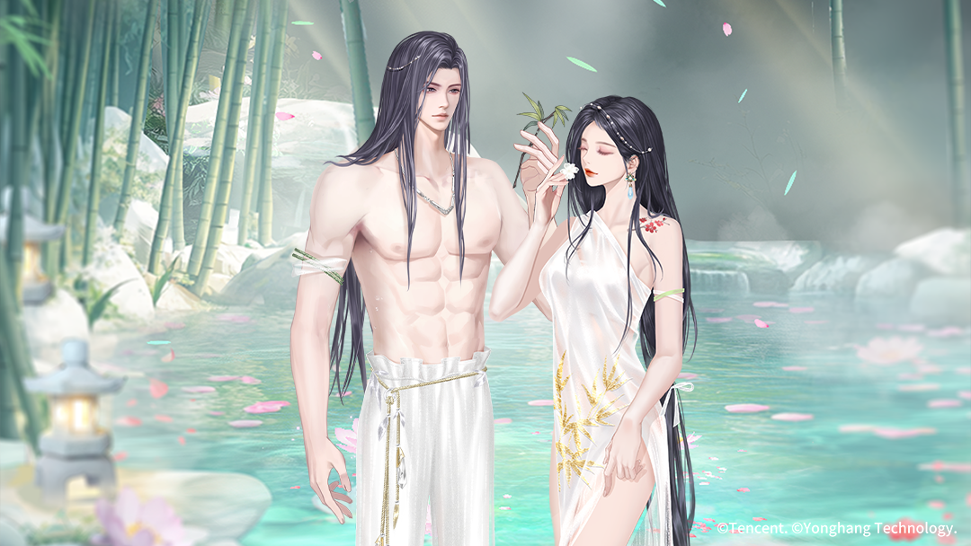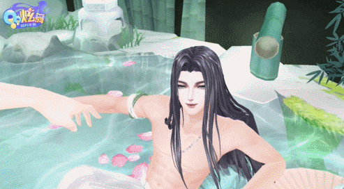 浴池雾气缭绕,水波微漾,女子缓步走近,轻抬素手,向男子探去~