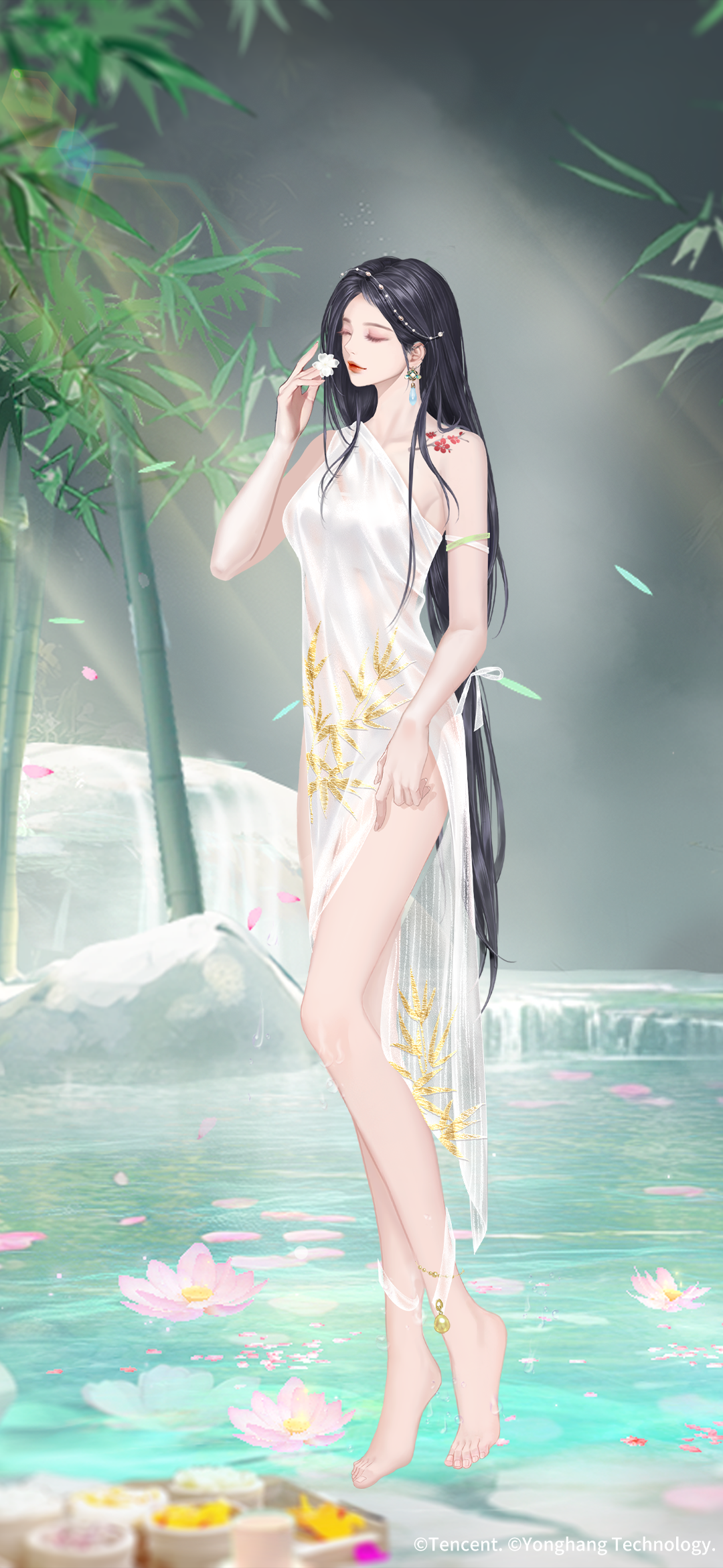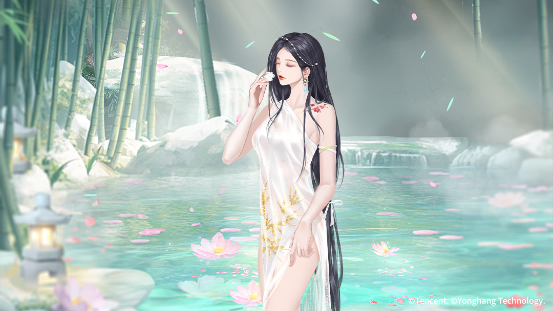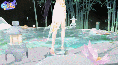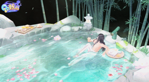 女子缓步走入浴池,指尖微抬,将一杯清茶倾洒,轻盈卧入水中~