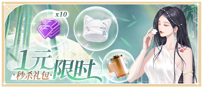 4月7日10:00至4月20日9:59期间,仅需1元即可把内含超凡头饰-猫耳棉布帽、钻石*10、胶卷*10的限时秒杀礼包拿下!