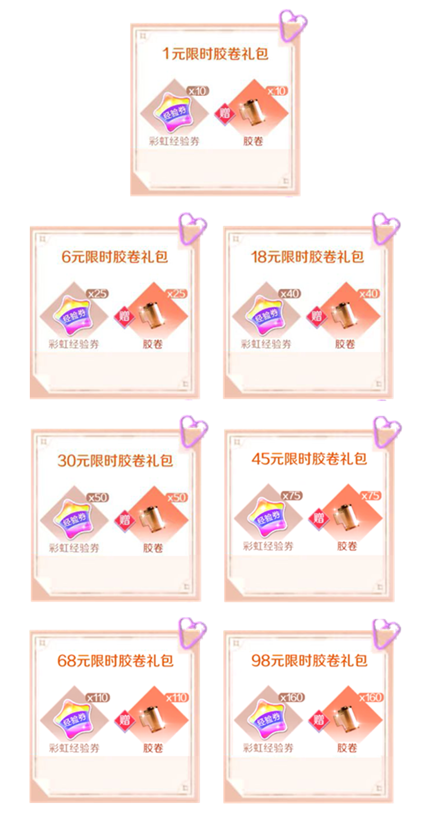 想将时装收入囊中?那就一定不要错过全新的限时直购活动哦~从明天(4月7日)开始,七档超级划算的胶卷礼包开售,一起领略新衣魅力~