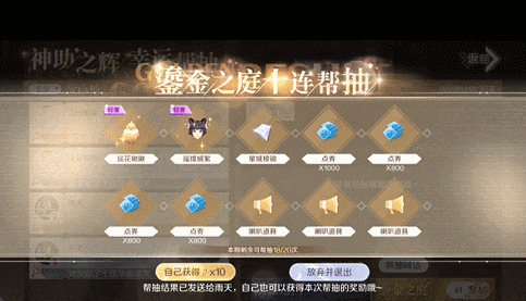 帮抽方进行十连帮抽时,若帮抽对象为同性玩家,则可在十连帮抽结果界面选择自己获得本次帮抽的奖励(也可选择放弃并退出)。