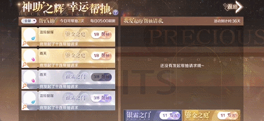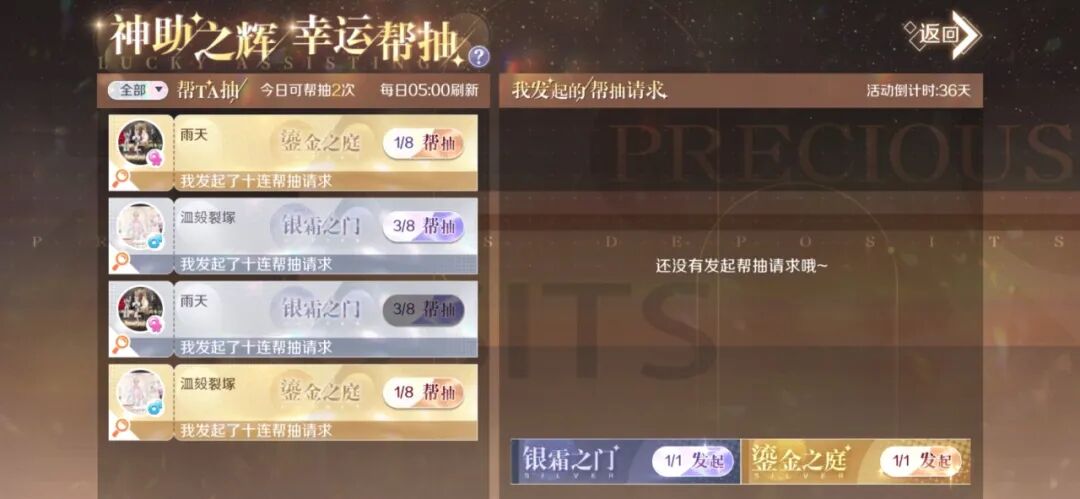 发起方发出帮抽请求时,不会消耗银霜秘钥或鎏金秘钥,也不会消耗鎏金之庭开启次数;每个帮抽请求可被帮抽最多8次。