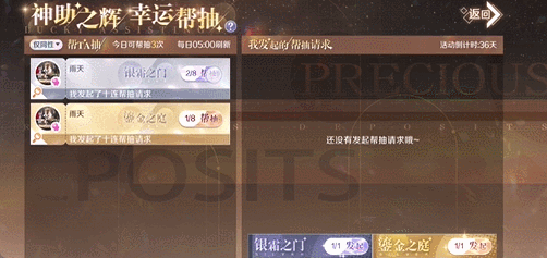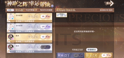 帮抽方进行帮抽时不会消耗银霜秘钥或鎏金秘钥,也不会消耗金门开启次数;可对每个帮抽请求进行1次十连帮抽,每次帮抽会消耗1次今日帮抽次数(不可对自己发起的帮抽请求进行帮抽)。