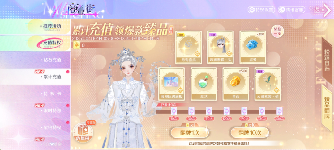若达到6元、30元、118元、348元档位,可直接领取对应奖励;累充348元可自选粉臻组合装-星星甜意/星星海滩,还可重置1次,也就是充值2次348元可得4套粉臻;达到每个档位可得抽奖券-星愿魔卡,进行抽奖有机会获得臻品组合装-月下良缘、轻奢组合装-云澜素裳、浪漫际遇底板!若每期充值超过2次348元的部分,下一期开始时,每10元可领1个魔卡礼盒;每集齐一套历史累充粉臻,将额外赠送2张抽奖券-星愿魔卡(具体规则请以游戏内活动界面为准)。