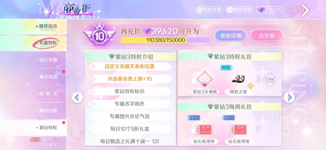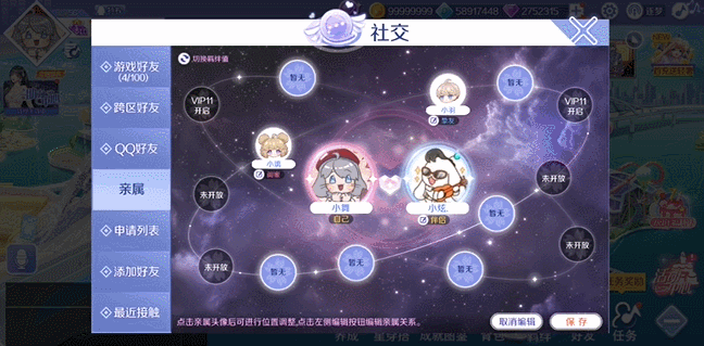 紫钻特权加入调整亲属界面的亲属头像位置(达到紫钻等级3即可开启),并可自定义亲属关系,快来解锁你的专属特权吧~