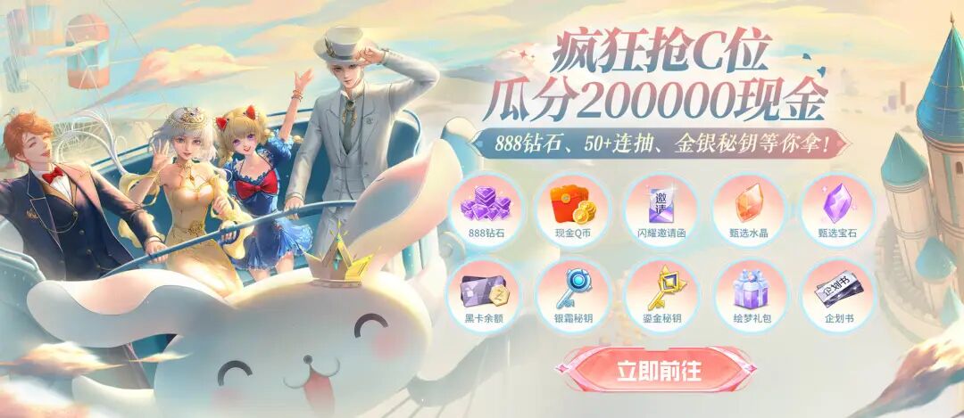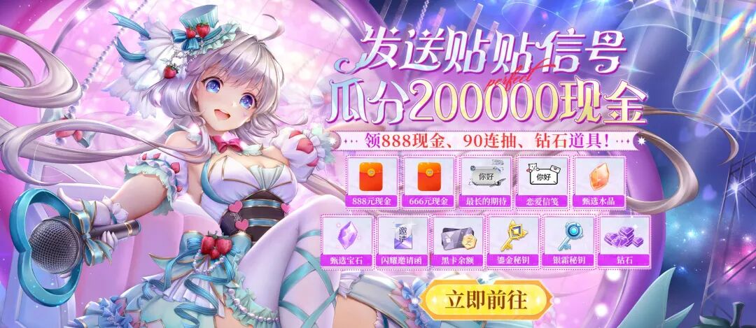 活动奖励:邀请贴贴官助力,可领取888元现金(概率得)/5元现金、666元现金(概率得)/5元现金、10元现金;绑定1位好友并与绑定好友进行1次信号互动,可领取最长的期待闪耀喇叭*10、恋爱信笺闪耀喇叭*10;累计发送指定数量贴贴信号还可领取钻石*66、鎏金秘钥*10(3天)、银霜秘钥*10(3天)、黑卡余额*10(3天)、闪耀邀请函*10等好礼。