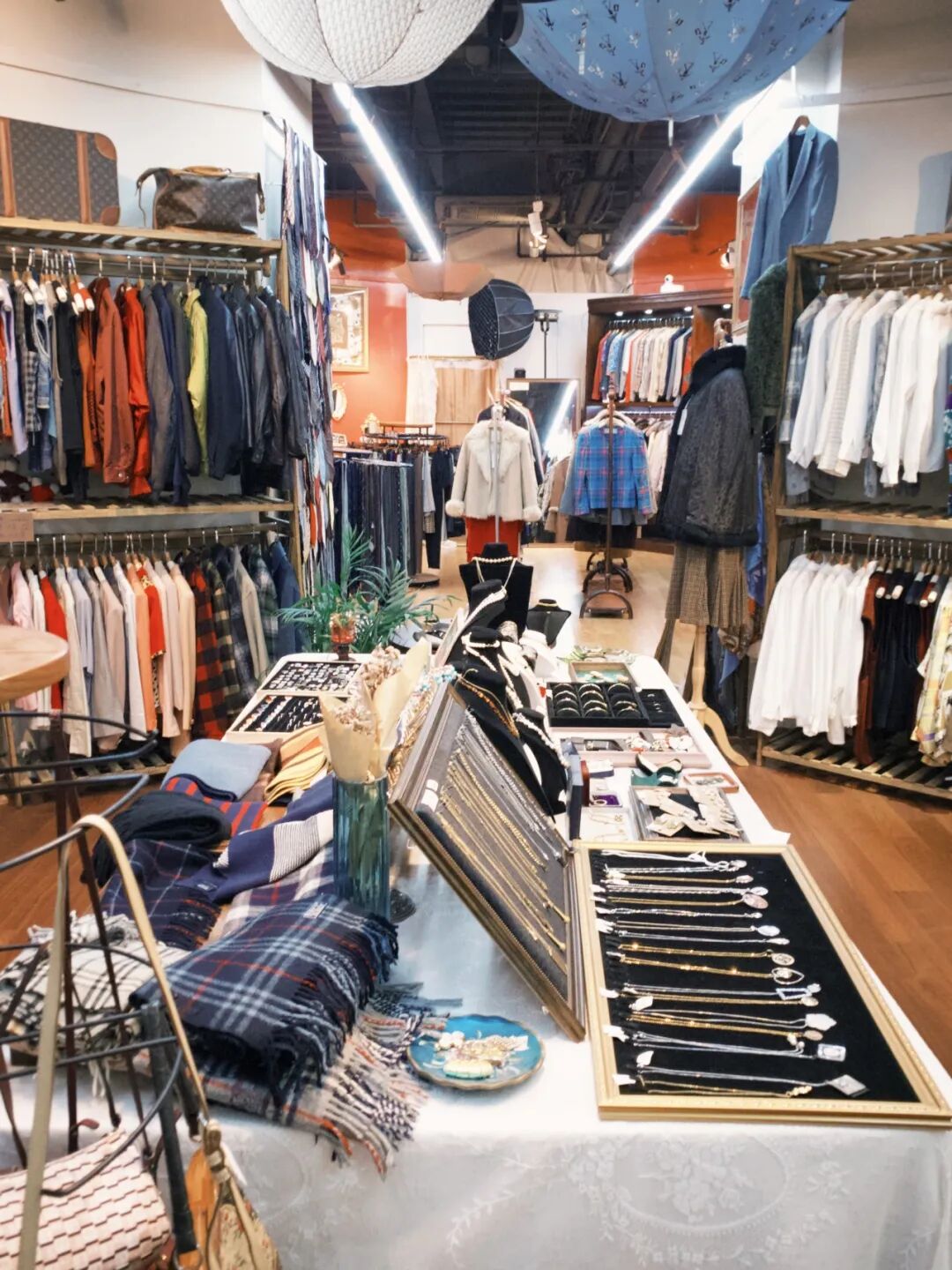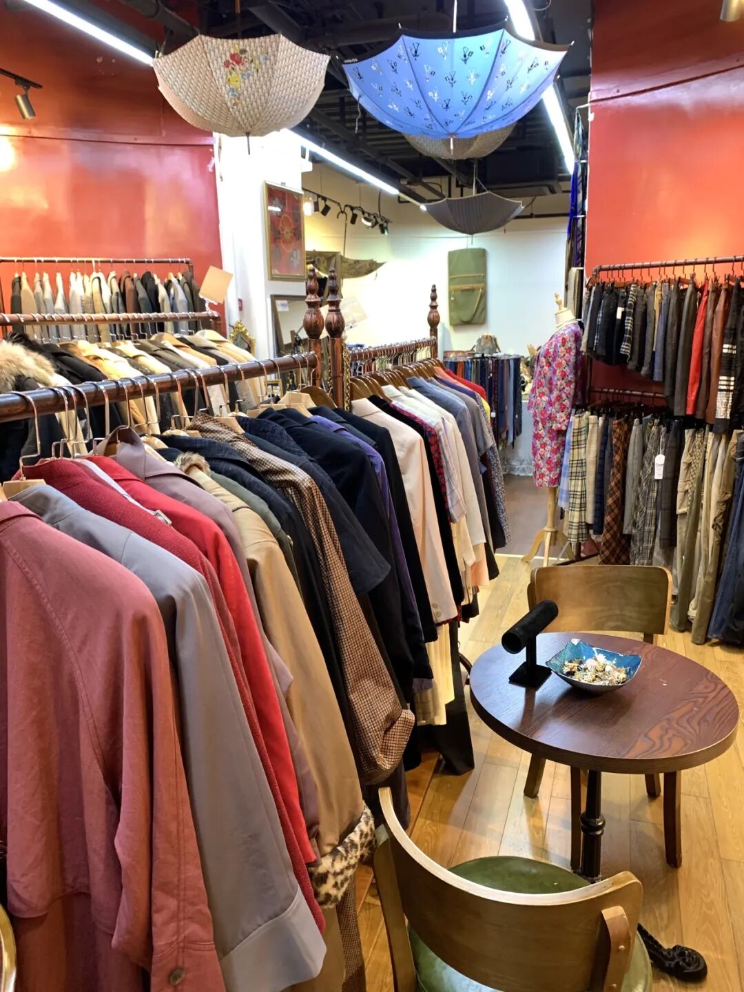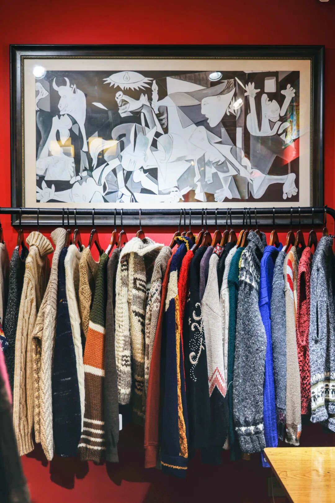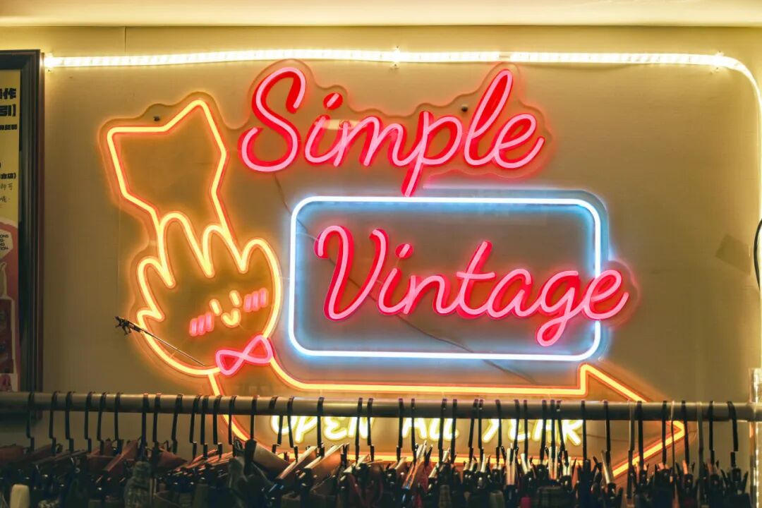 “simple vintage”位于万通中心,用霓虹灯带装扮的门头增添了一丝美式个性。店内大多是以日本、泰国、欧洲为中心的产物,穿的戴的踩的挂的配的玩的…...除了一些y2k牛仔衬衫半裙,也有不少老电影中常见的赫本裙、波普钩花毛衣、风衣等等。从19世纪初期到80s,最早甚至可以追溯到70年代。