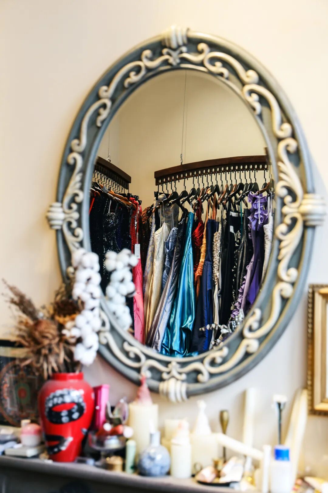 “这古屋”藏在西湖区的艺创小镇,从外观看去,就像是20年代一些名流们参加舞会时挑选服饰的地方。店门口布满了绿植花卉,格外引人注目。推门而入,时尚的橘红色墙漆,衬得浓烈的复古气息从大面积透出。目光所及之处,迷人的孤品首饰和二奢服饰带着岁月的痕迹和味道整整齐齐罗列着,简约而不失优雅,流动着那个年代名流复古的厚重感。