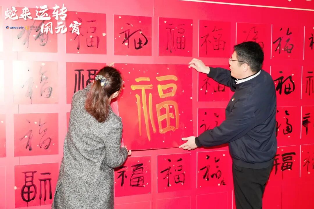 集送百福,请君纳福。写福字表示我们对新年的期待和祝愿。我们希望在新的一年里能够拥有幸福、吉祥、富贵、健康、平安等等美好的事物。此次游园会特设置百福墙区域供员工们写福祈祷,活动现场,前悦社区许(维)书记和公司领导王(臣章)总共同完成一副“福”字,组成百福墙,为大家送好运。