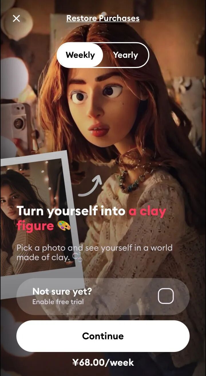 直接在App store 搜索“Remini”,找到后点击下载APP,(记得打开魔法工具)打开APP在首页,选择新功能“turn your world into clay”,找到Clay Filter黏土滤镜,系统会调整到高级权限页面,记得勾选条约,即可获得7天免费使用权限。