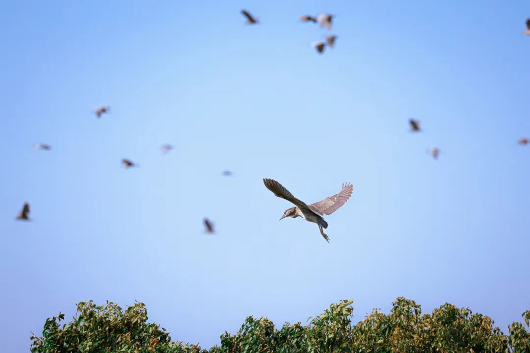 成群结队的鸟儿们于树顶飞舞