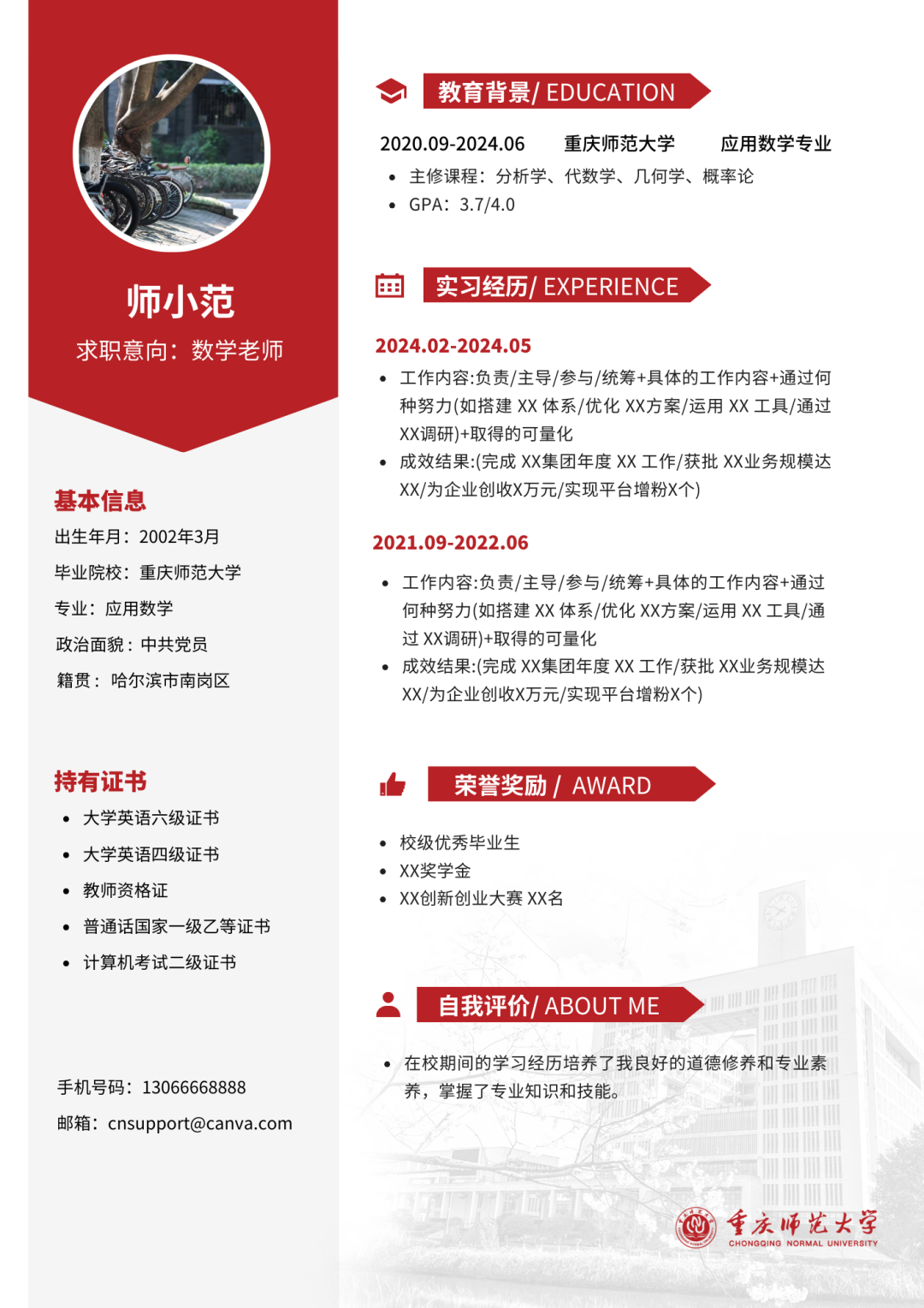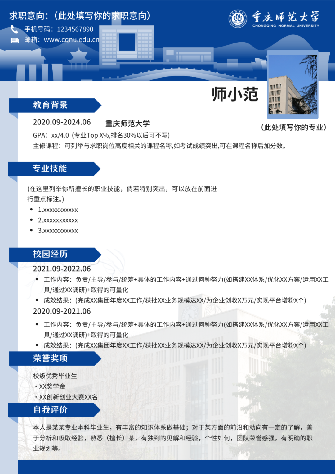既有重师特色简历模板