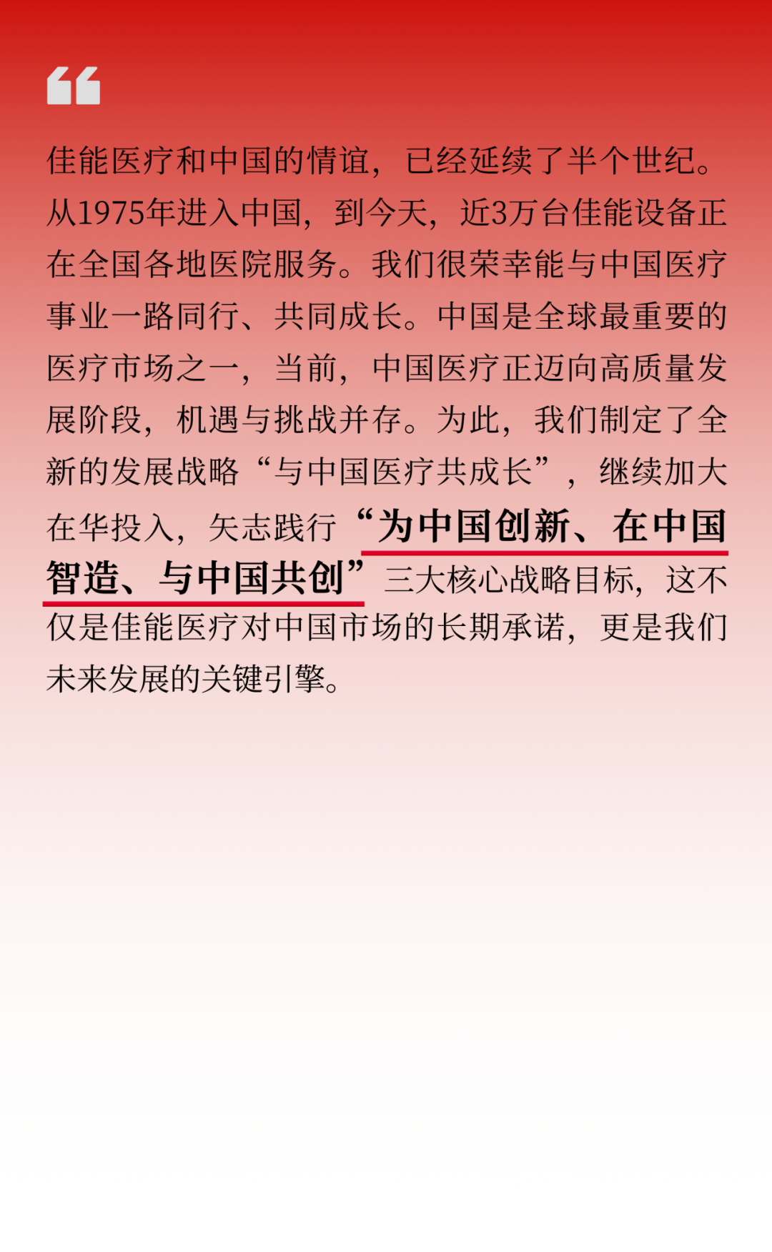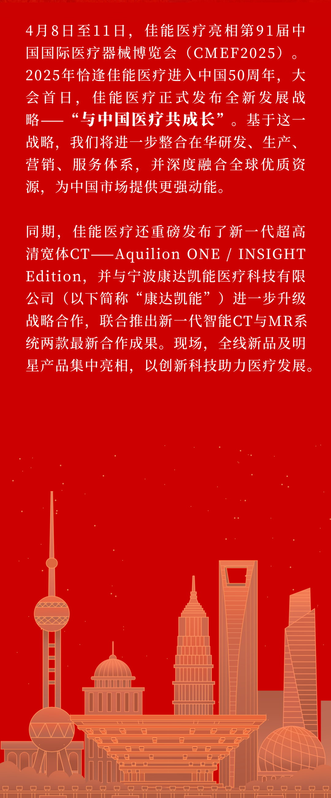 自1975年进入中国,佳能医疗始终践行“Made for Life”理念,为中国医疗行业提供先进技术与优质服务。目前,佳能医疗已经在中国布局两大研发中心,建立了总面积达数万平方米的生产基地,销售服务网络遍布全国,正以完整的本土价值链持续深入扎根中国,助力行业高质量发展。今天,站在下一个50年的全新起点,佳能医疗将继续深化战略布局,持续投入,进一步拓展深耕中国市场的深度与广度。