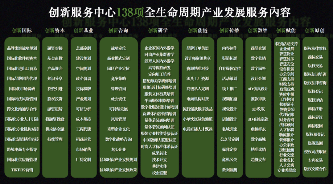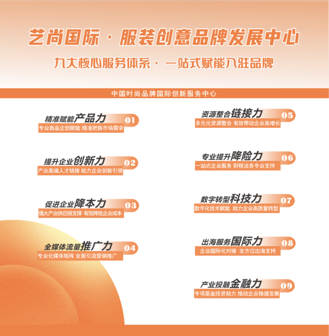 基于这种深度的行业理解,针对时尚品牌定制“九大核心服务体系”、“138项全周期产业发展服务内容”,确保能够精准满足入驻企业的实际需求,为企业发展提供强劲动力。