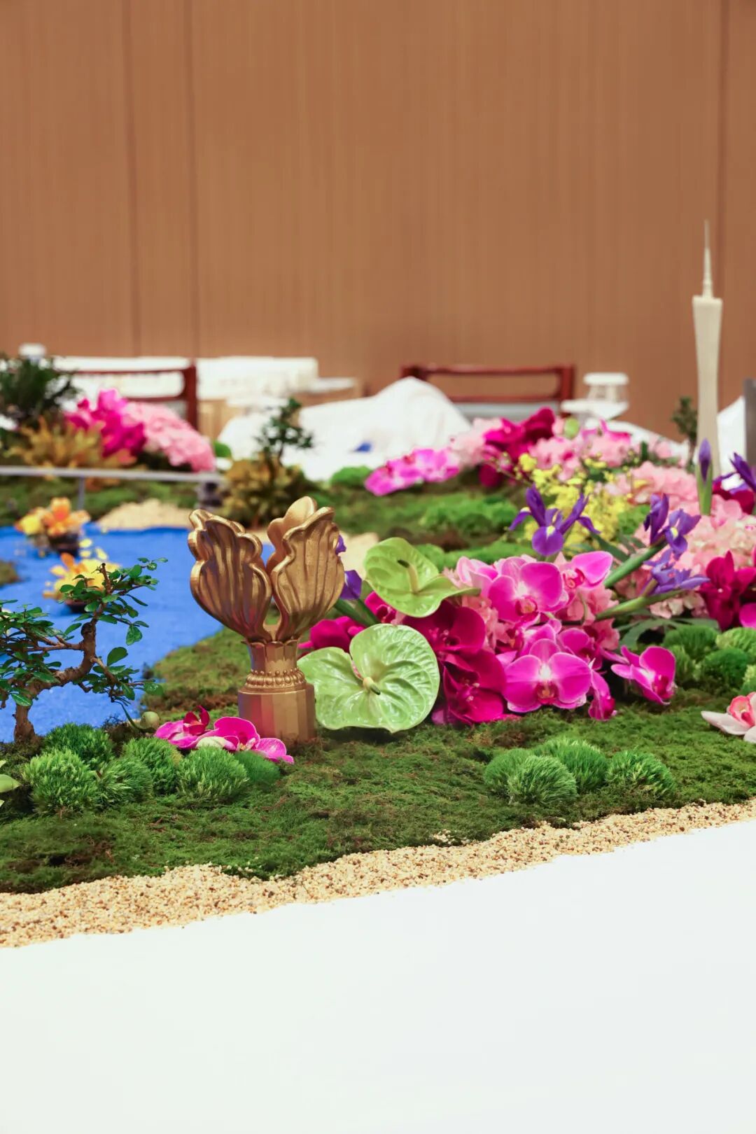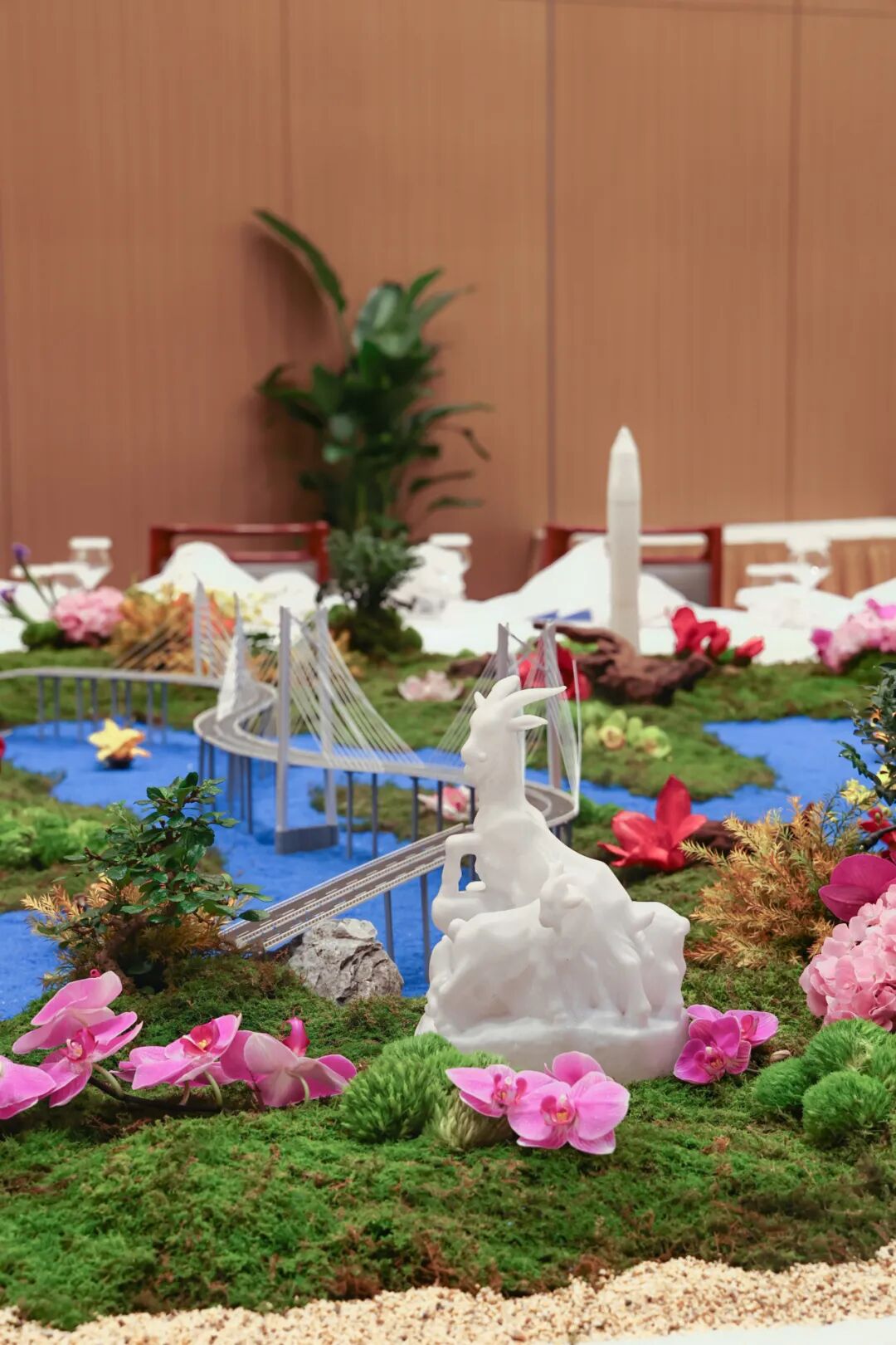 餐桌花艺上粤剧、越秀五羊雕塑、广州塔、港珠澳大桥及永远盛开的紫荆花等元素完美融合,海水般的蓝色是沿海地区相连的脉搏,亦是明珠焕发新彩的光辉。充分展示了粤港地域相连、交流合作的深厚情谊。