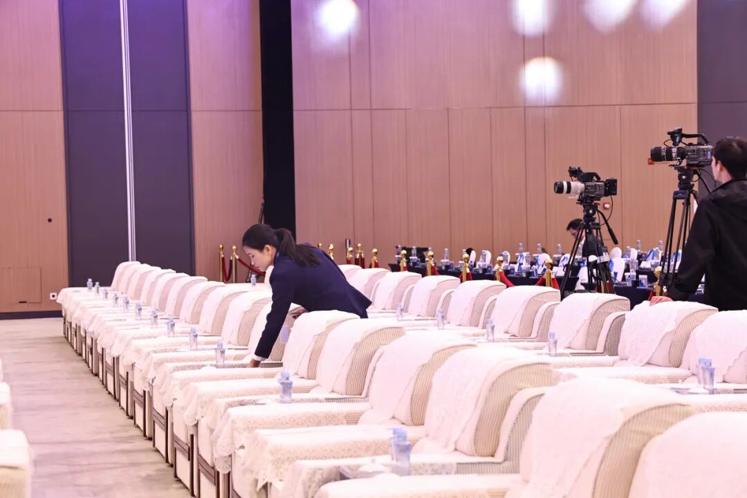 会议中心贵宾服务团队为参会人员提供高水准会议服务,从水杯的摆放到贵宾位上,每一个环节的呈现,均是背后不辍练习的成果,以细节体现卓越品质,用态度成就会议完美举行。