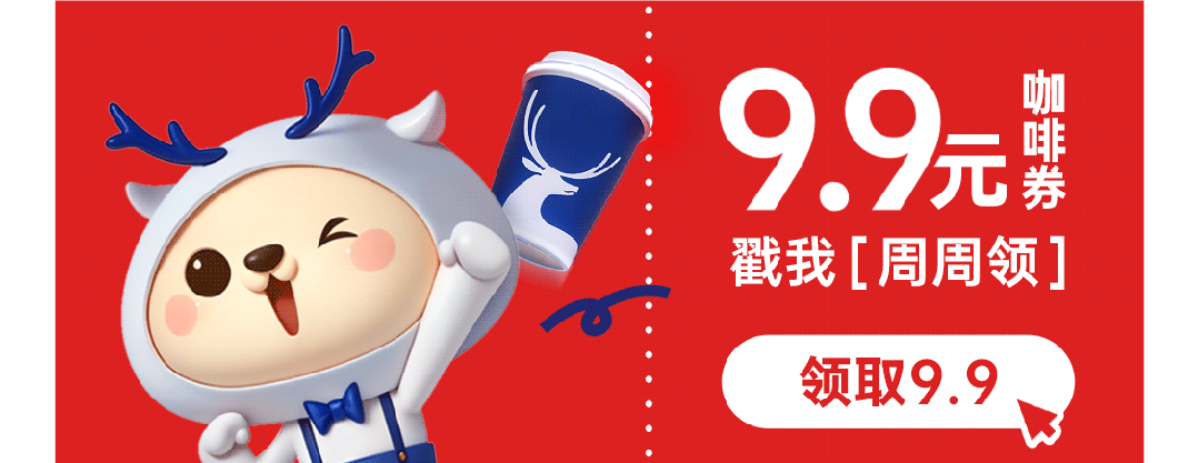 *所有渠道每周限领1张【周周9.9元券】,仅限部分门店部分饮品使用,活动规则详见瑞幸咖啡APP/微信小程序活动页面。