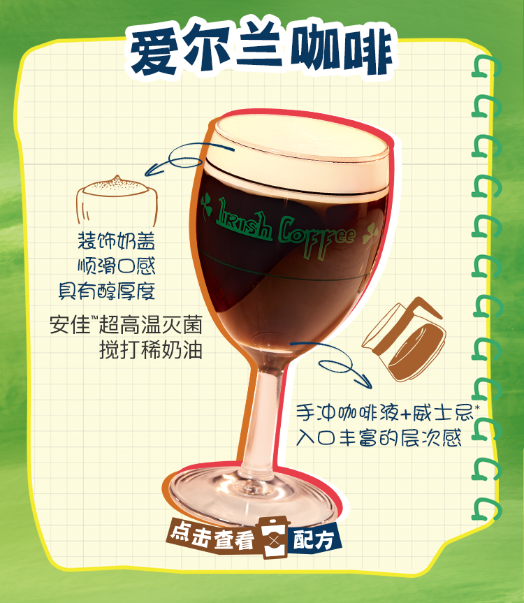 *本款“爱尔兰咖啡”中威士忌的含量约为30ml。未成年人请勿饮酒,孕妇、心血管疾病等身体状况不适合饮酒人士、驾驶员请慎重饮用。请勿酒驾、醉驾。