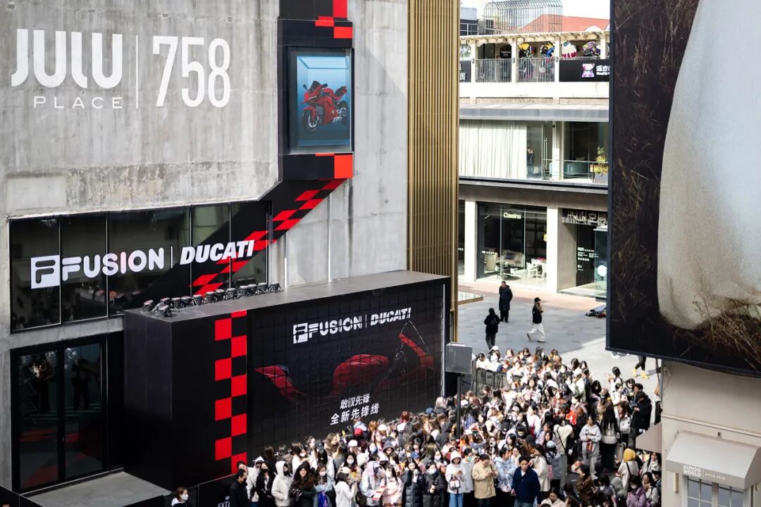 外墙上一辆DUCATI摩托车俯冲而出的画面,打造震撼的视觉效果,瞬间将人拉入一场极速运动与美学设计交织的沉浸体验中。