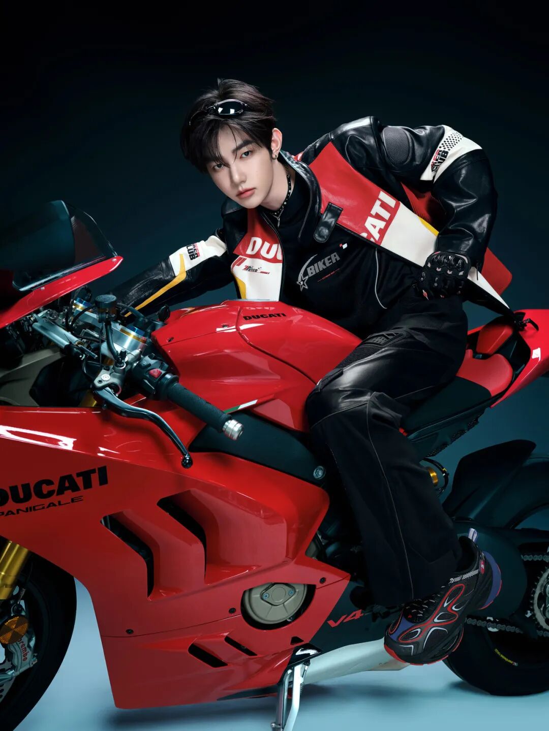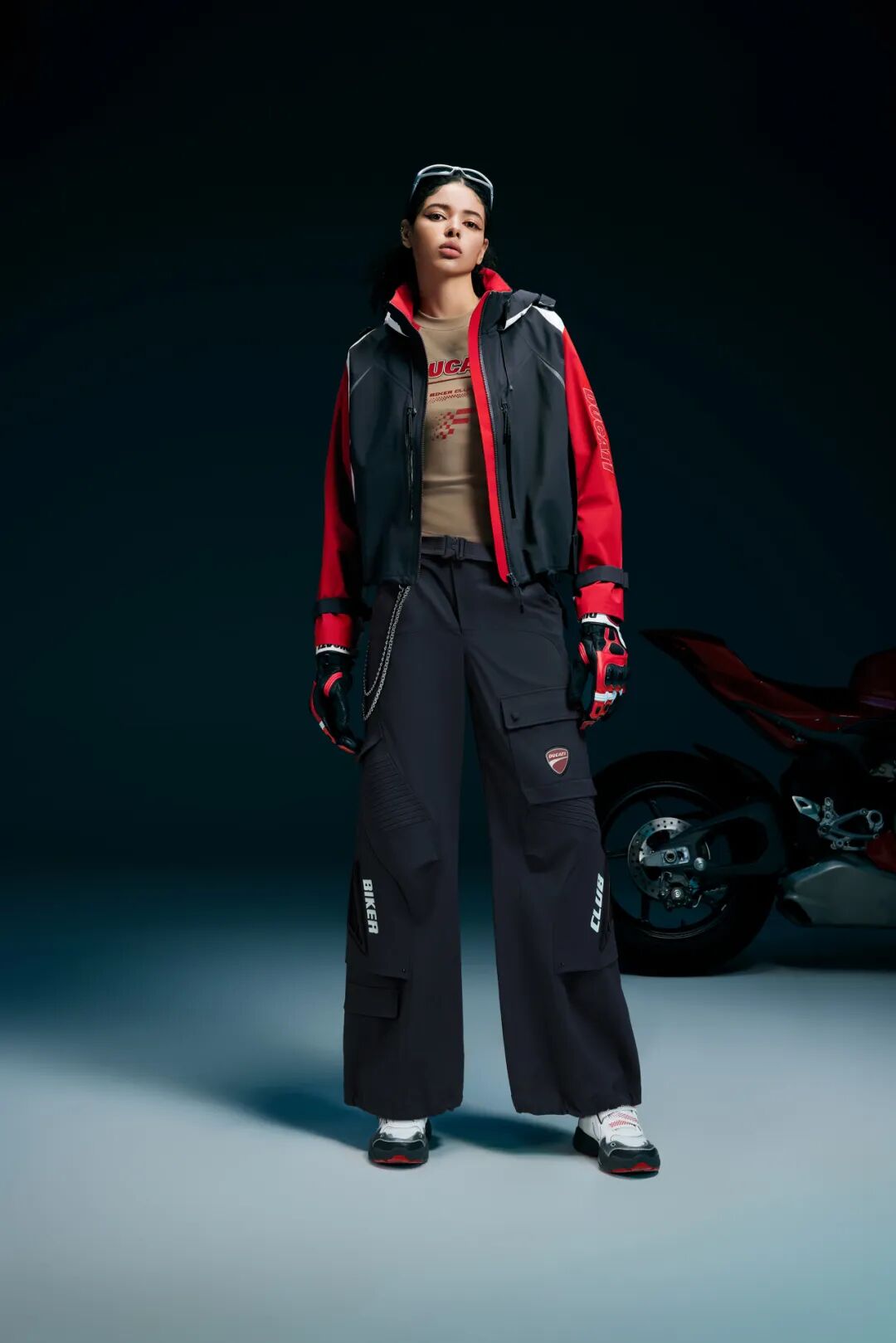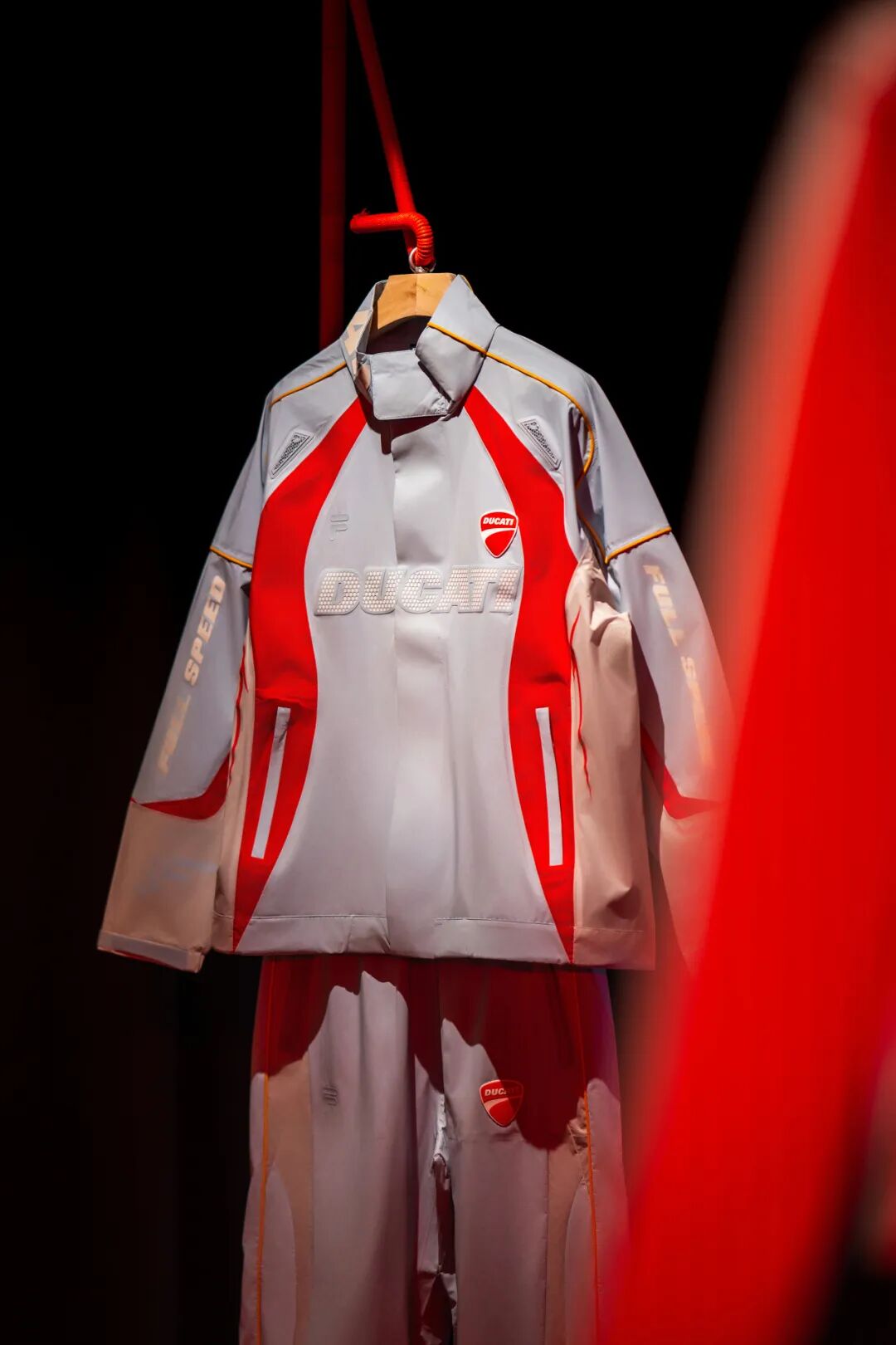 联名系列共推出了两款皮衣,男款皮衣采用优质牛皮,配色灵感汲取自DUCATI经典车身涂装,通过色块拼接营造丰富视觉层次。搭配的梭织长裤看似简约实则细节满满,使用耐磨CORDURA纱线制成,膝盖处的3D机车徽章为整体增添硬核感的同时不失精致。