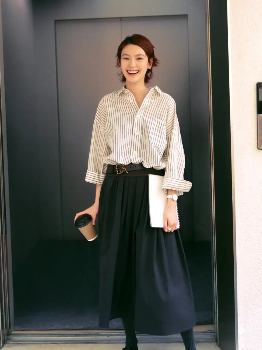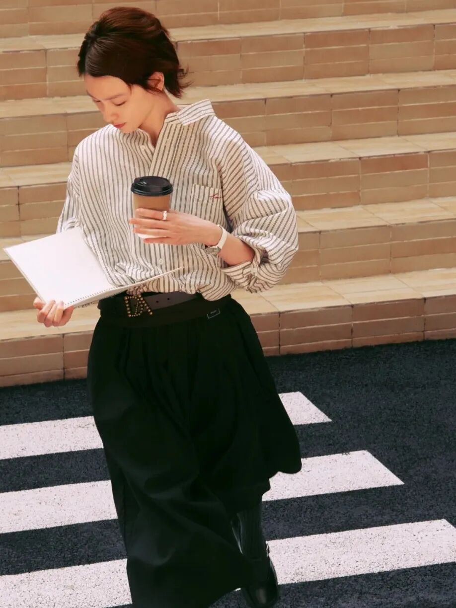 都市休闲时刻,DAZZLE宽松廓形条纹衬衫搭配中长伞裙,清爽感即刻Get。伞裙采用户外记忆材质,柔软不失立挺廓形,一套上身畅游美好春日。