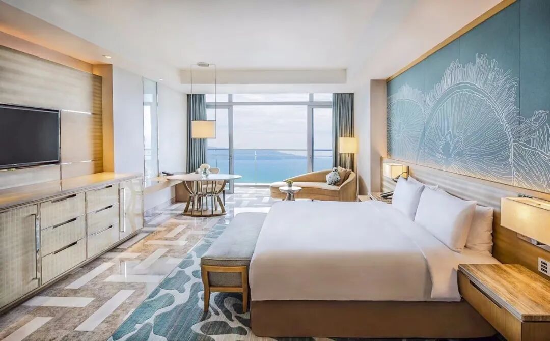 酒店1314间海景房,每一间都可以远眺和俯瞰不同角度的海景,房间开阔舒适。珊瑚花纹的地毯、窗帘,为整个色调增添清新雅致的淡蓝温柔,宛如卧入海底世界。