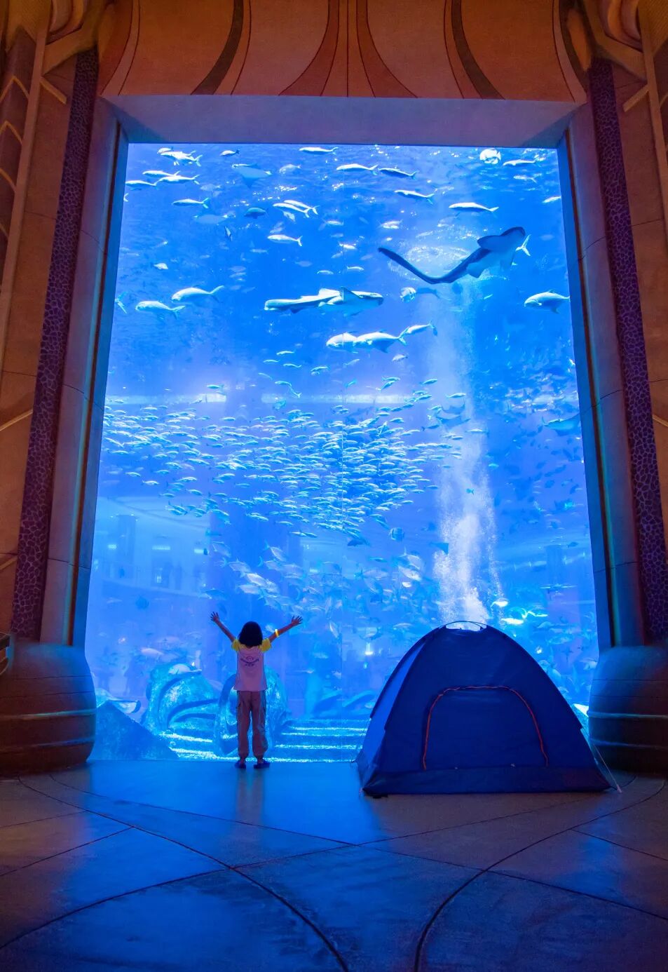 这是属于三亚的晚安,在亚特兰蒂斯里,孩子们和鲨鱼说晚安,让魔鬼鱼陪伴入眠,用真实的海底故事代替童话,感受鱼儿的呼吸。
