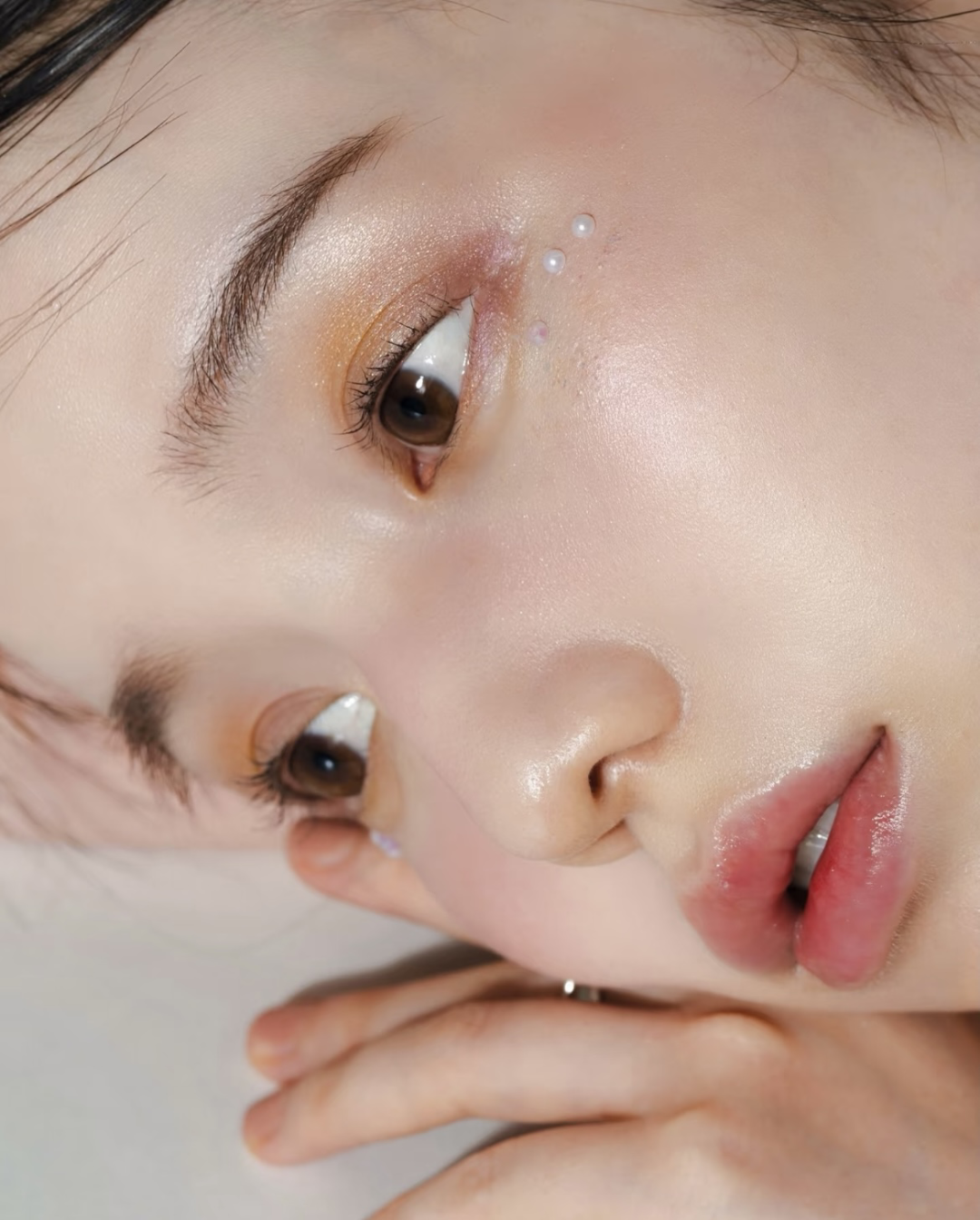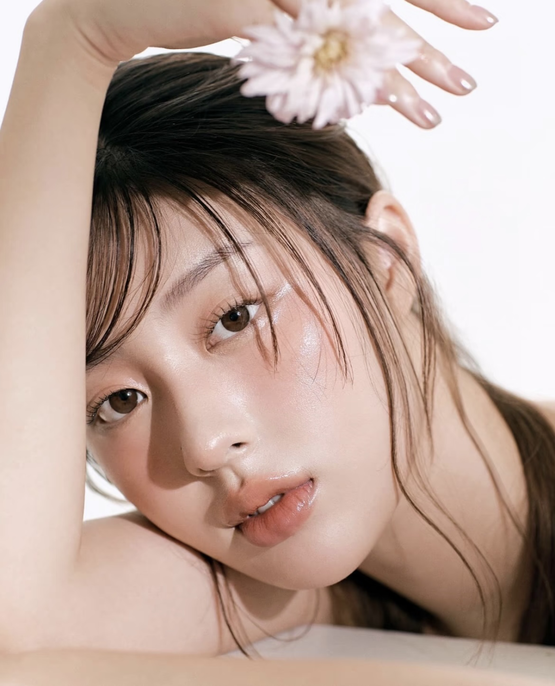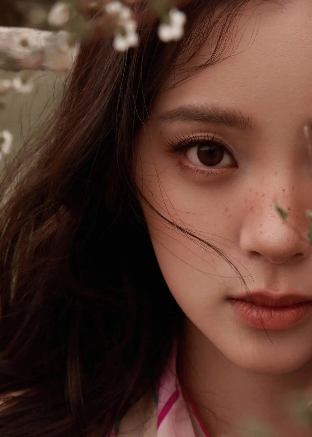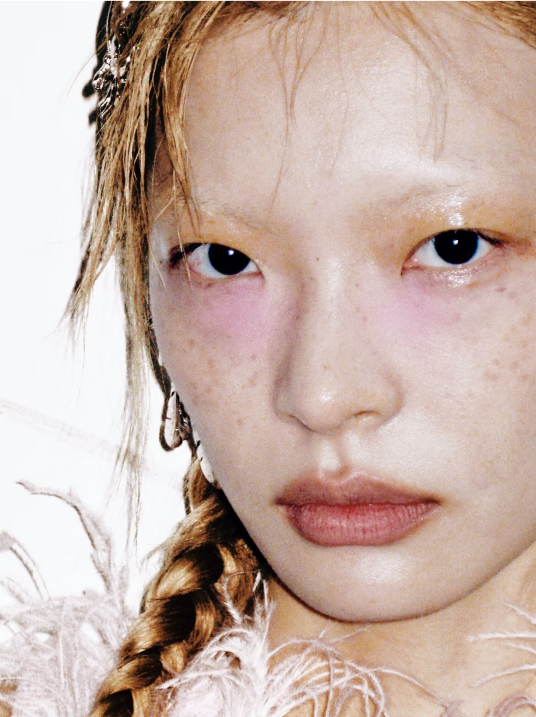 迁移到妆容上,就是利用低饱和度、通透晕染、统一色温这三要素柔化五官,将整体氛围调整成为柔软模式,视觉上轻松打造出奶油雾面的滤镜感。