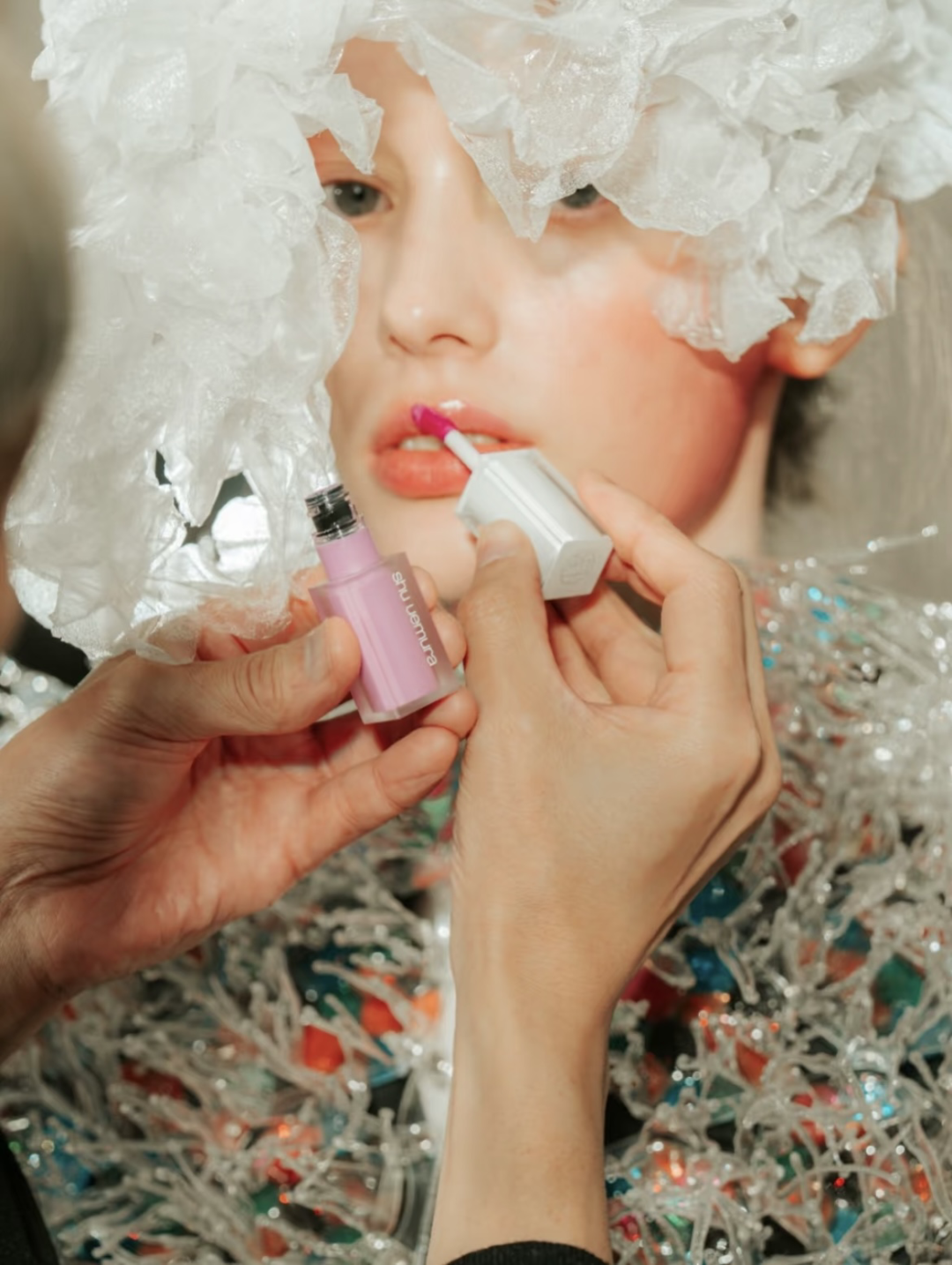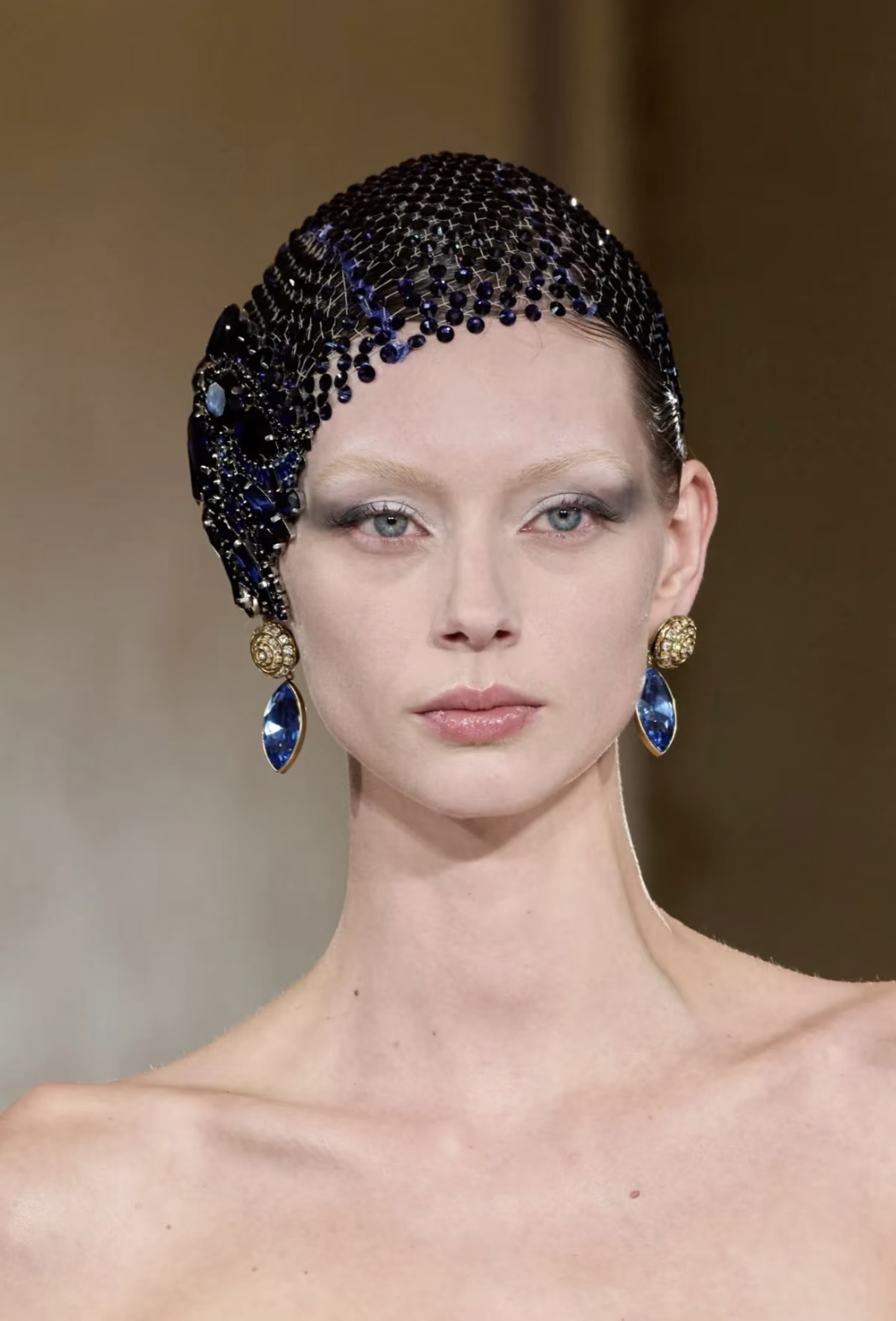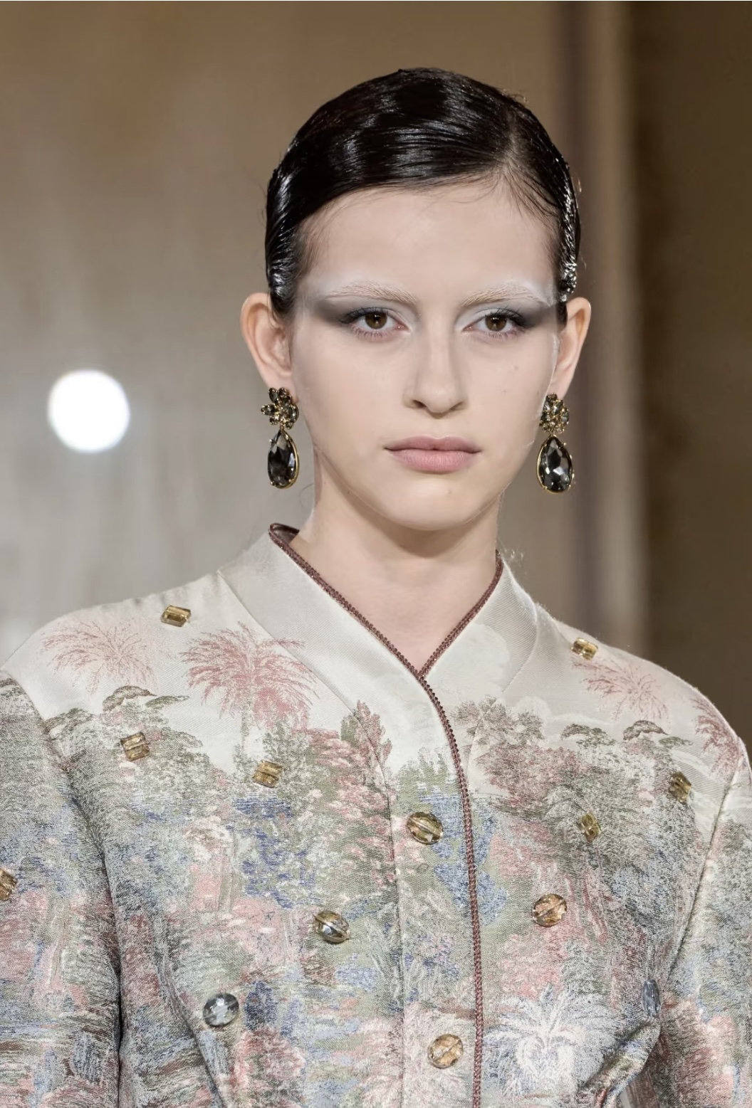 而在Armani Privé 2025的春夏高定秀场上,模特们的妆面以柔粉色腮红与雾感灰调眼影为核心。整张脸像在绸缎上撒了一层月光,配合珠光面料和轻薄材质的服装,宛若一副泼墨山水画。