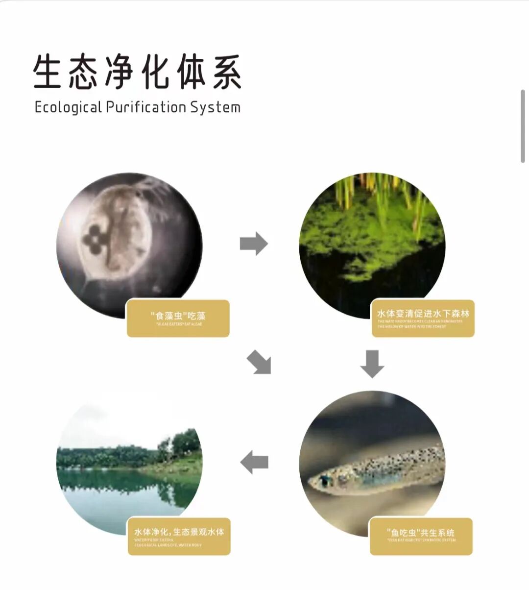 采用食藻虫引导的水体生态修复技术-简而言之为,虫吃藻,鱼吃虫,水草构建自然的一种纯生态系统。其中用的食藻虫和水草分别都经过了培育,获得了国家发明专利和美国发明专利。所构建的生态系统尽量遵循当地自然因地制宜,以达到长效之水,自然净化的目的。
