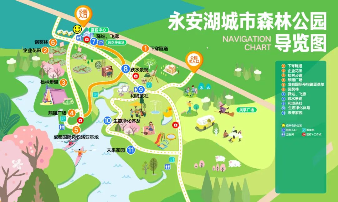 公园内共有卫生间共计4个,分别位于:游客咨询服务点、路亚基地、和境茶社、风筝广场。