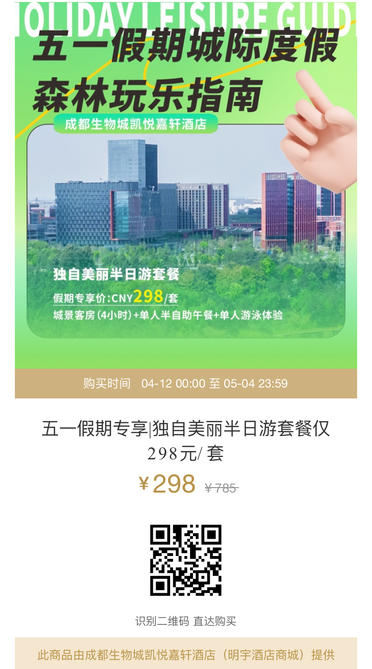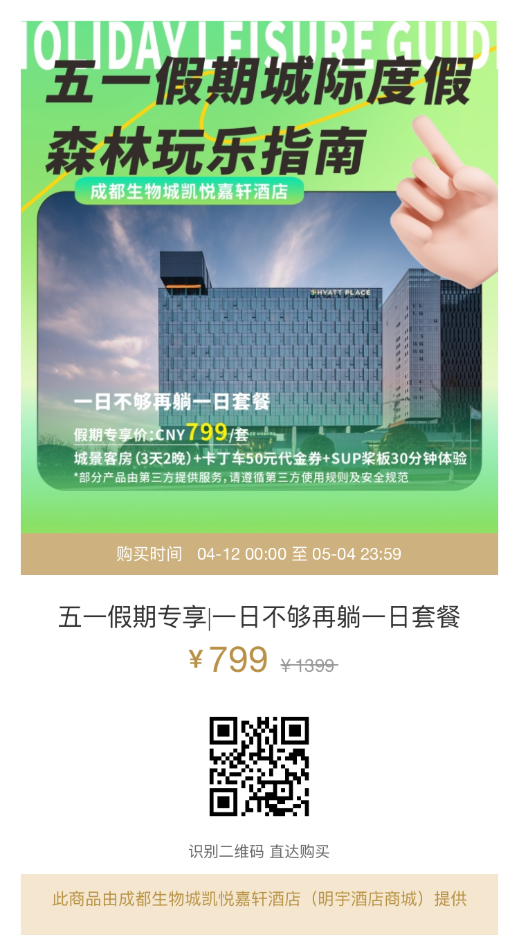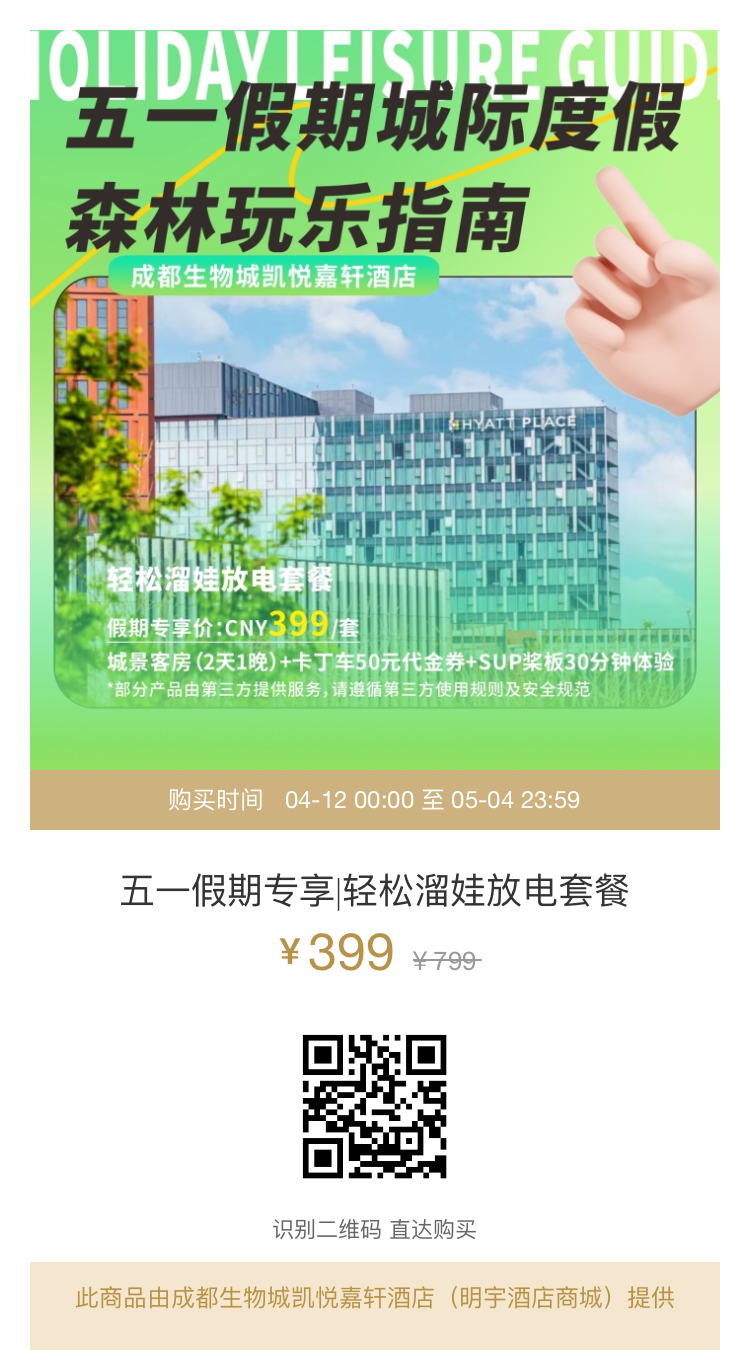 毗邻永安湖城市森林公园有着一家星级酒店——生物城凯悦嘉轩酒店。这里作为公园的“能量驿站”,近期推出了五一假期优惠福利,快来滑动查看扫码抢购吧!