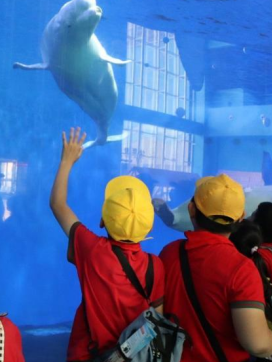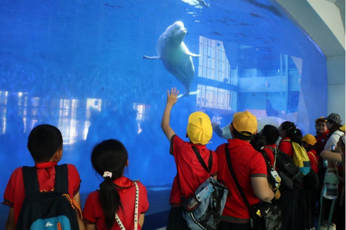 海洋奇妙之旅开始了蔚蓝的水里,形色各异的海洋生物在游弋,自由穿梭其间,还有可爱的海狮、凶恶的鲨鱼、淘气包魔鬼鱼、憨态可掬的企鹅、珍贵的江豚……看得同学们目不暇接。