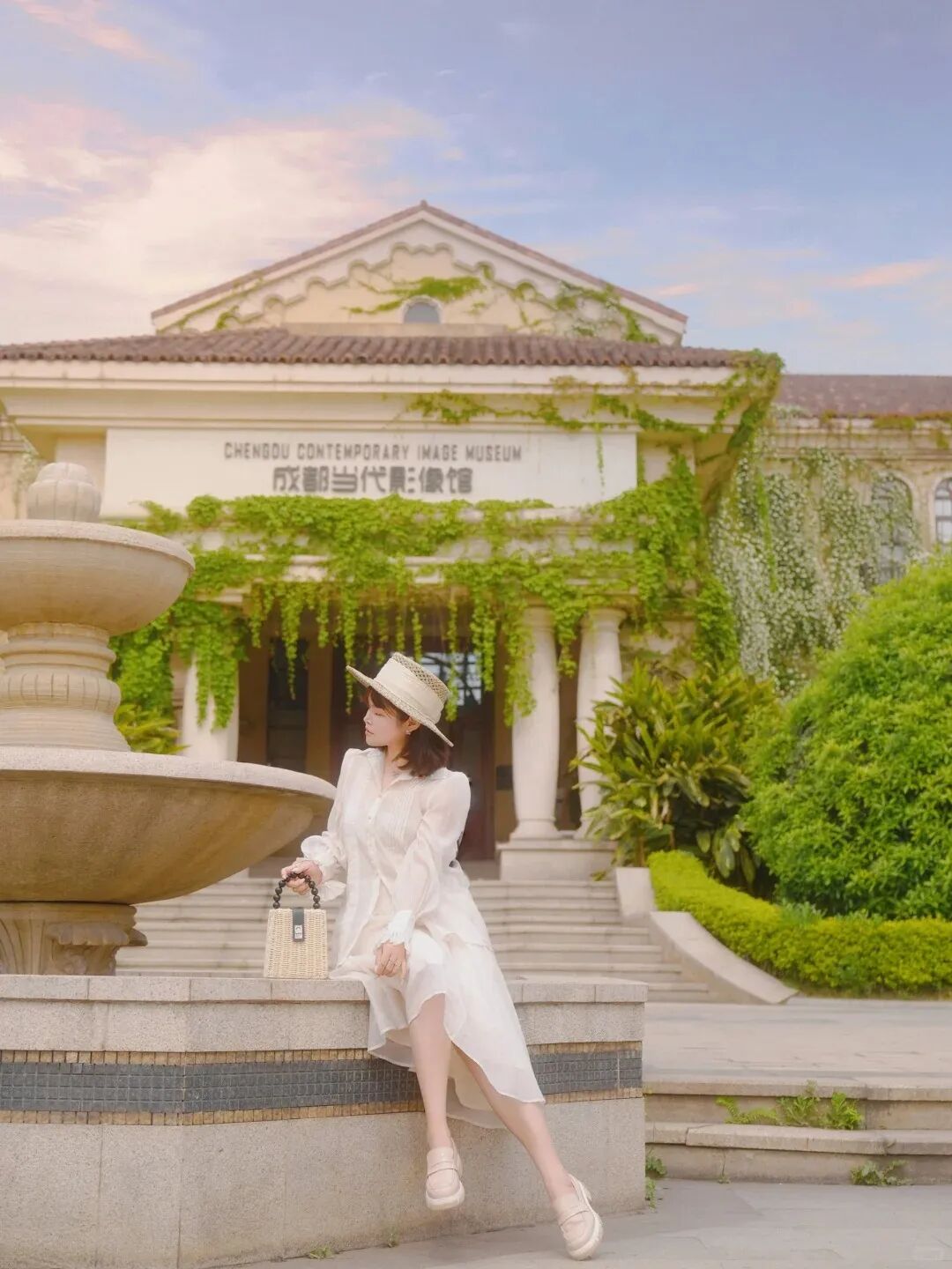 3. 影像馆门口喷泉:以建筑为背景,出片更有高级感。