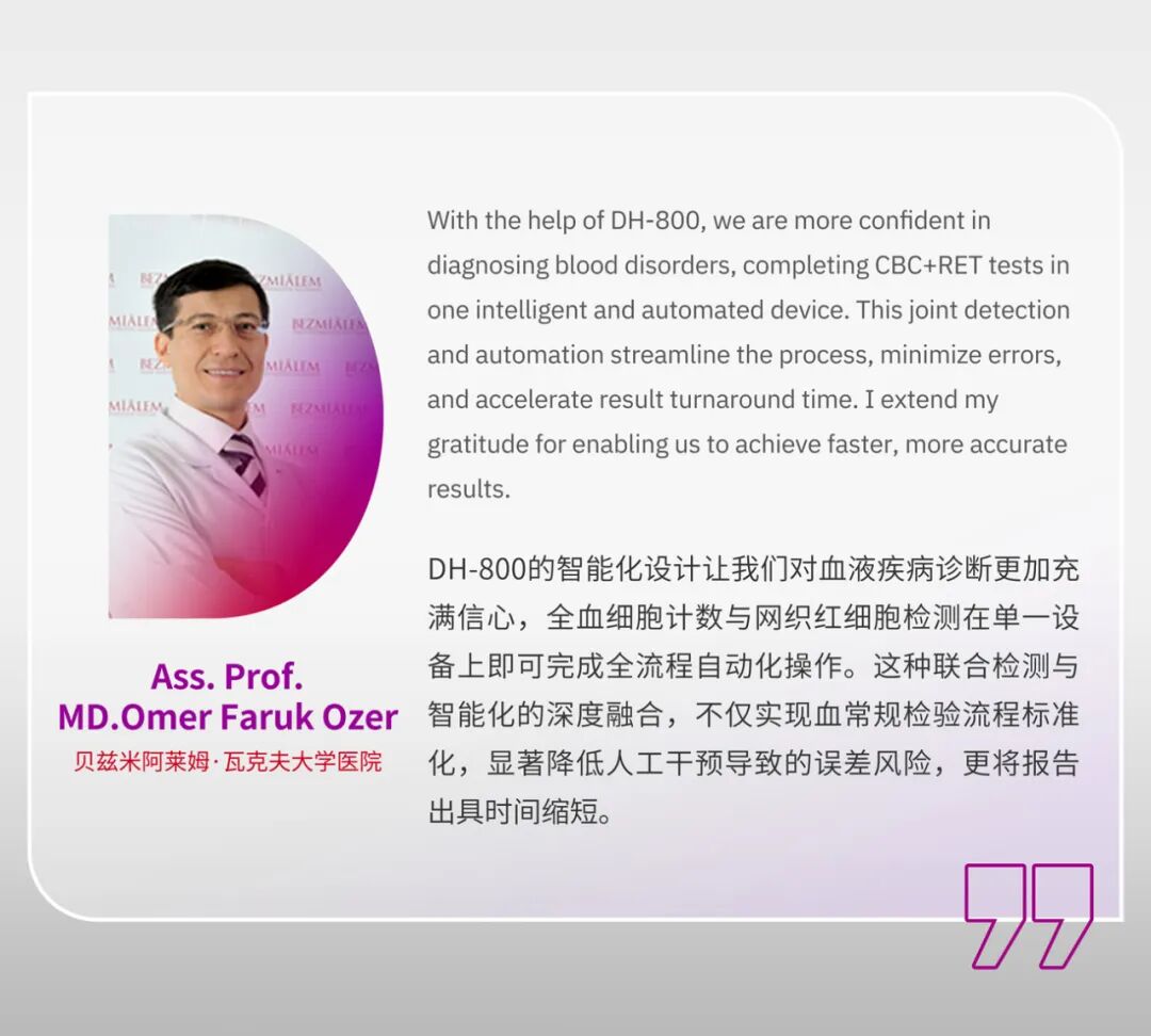 “DH-800的网织红细胞检测功能显著提升了我们对血液系统疾病的诊断能力。”经过几个月的运行,DH-800迅速成为检验科工作中不可或缺的一员。DH-800集合血常规六分类、有核红细胞、网织红细胞及体液等多种检测功能于一体,同时开创性融入AI辅助分析技术,助力实验室异常细胞识别能力提升,图文形式的可解释性报告,让结果审核更省心。