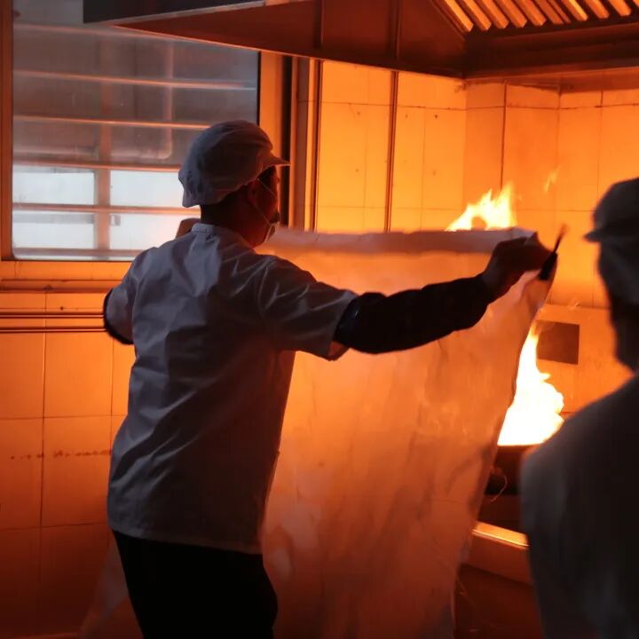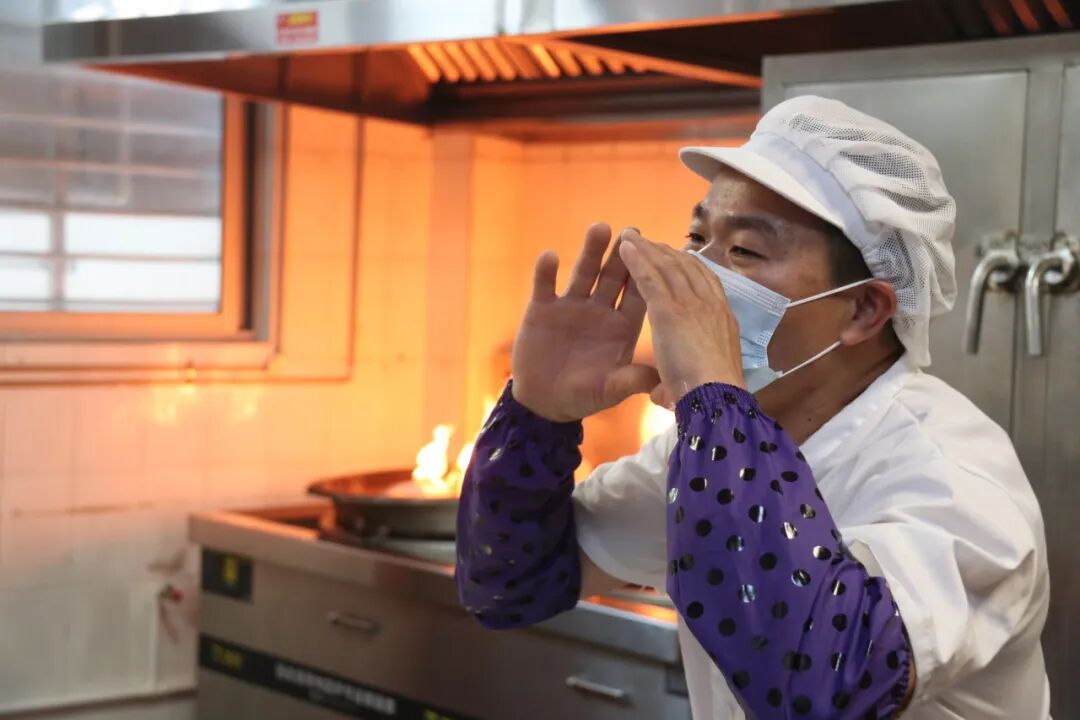 演练开始,食堂操作间内突然“浓烟滚滚”,油锅起火窜起1米多高火焰。发现险情后,食堂廖师傅立即启动“一喊二关三覆盖”的应急程序:第一时间高声呼喊“油锅起火!”示警,同时迅速关闭燃气阀门和电源,并使用手边的灭火毯尝试覆盖进行初期灭火。其他食堂工作人员听到呼救后,立即按照应急预案展开行动,同步完成“三个动作”:有人按下手动报警按钮,有人迅速拨打学校安全管理部门电话报告火灾情况,有人取来灭火器协助灭火,有人负责疏散周边人员,确保通道畅通。
