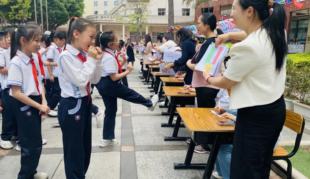 你会用手势和表情传递“yummy”“happy”“I love China”吗?在这个环节,三年级孩子们通过动作、表情和语言演绎不同国家的代表性事物。脑洞大开的创意表达、默契十足的团队配合,让英语从“课本上的文字”变成“看得见、摸得着”的肢体语言!