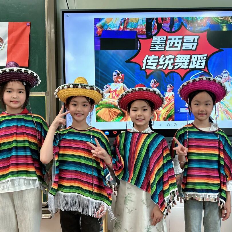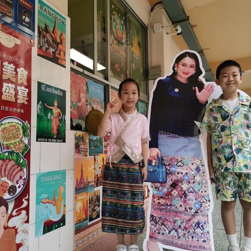 师生们化身为“文化大使”,围绕中国、亚洲、美洲、欧洲等不同地域主题,精心打造了沉浸式的“国家展馆”。从校道上挂满的万国旗到教室内的五彩装饰,学生们热情参与,通过双语手账、手工制作、风俗喷绘、视频观影、T台秀等多种形式,生动地展示了各国的文化民俗、特色美食、多彩服饰、建筑艺术以及礼仪禁忌等精彩内容。看!小学部各楼层俨然成为了融合世界各国风情与文化的“互动区”。