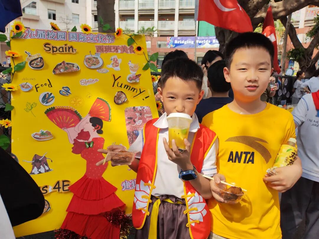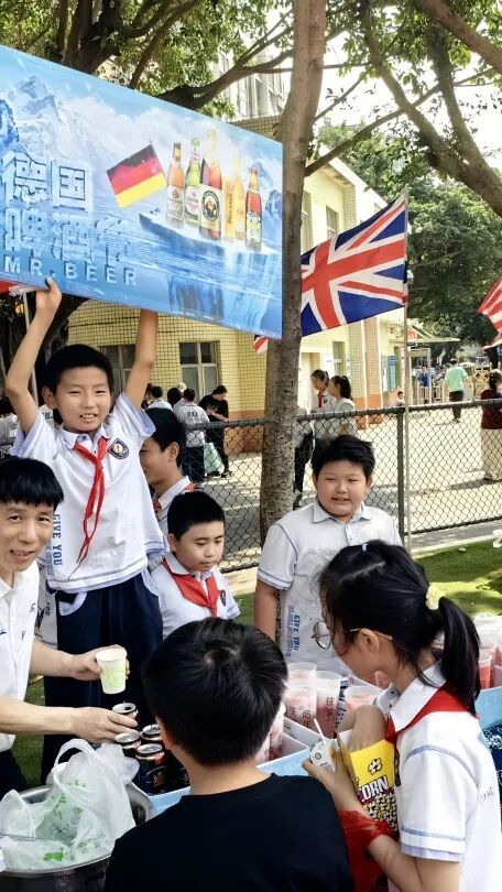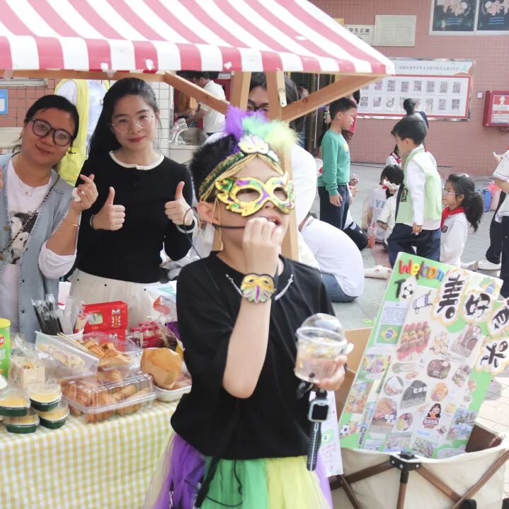 班级摊位由教师、学生和家长共同策划,各班的“文化宣传官”和“美食推荐官”自主设计造型,并积极推介各种风味美食。为了吸引游客,一些班级还设计了趣味游戏和歌舞体验。这些活动不仅让学生在实践中提升了语言表达、团队协作和理财能力,还有效拓展了他们的国际视野。