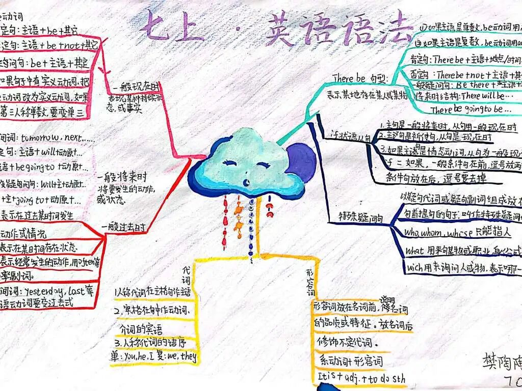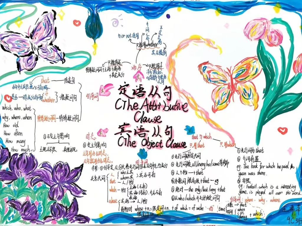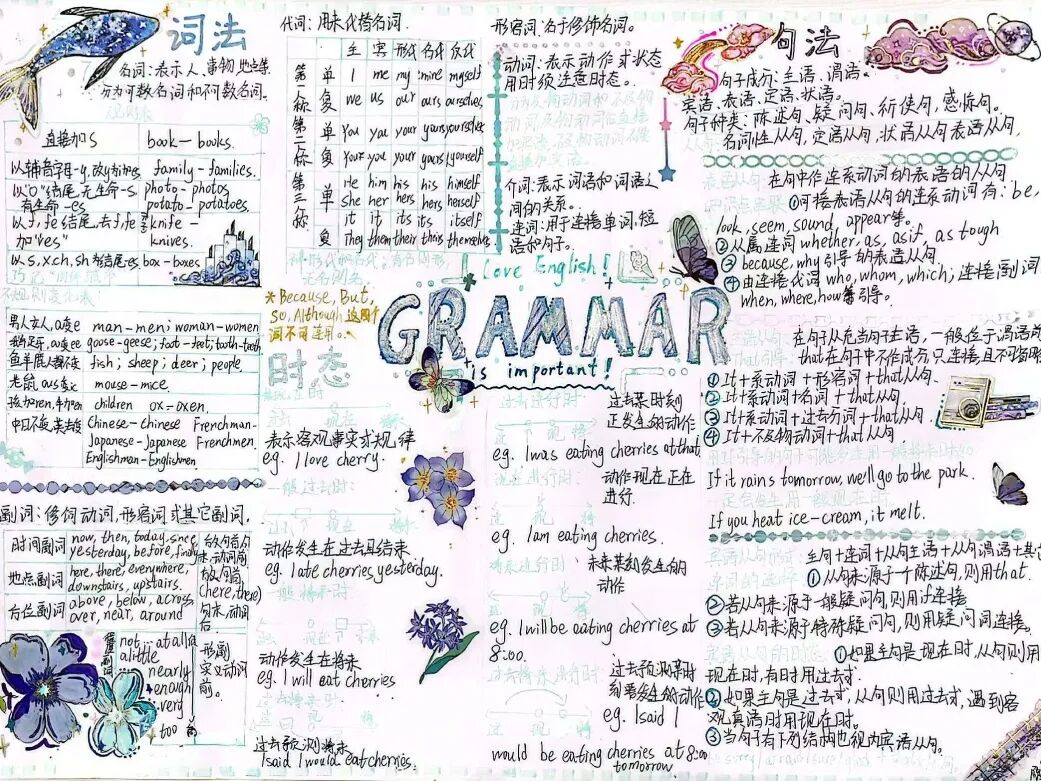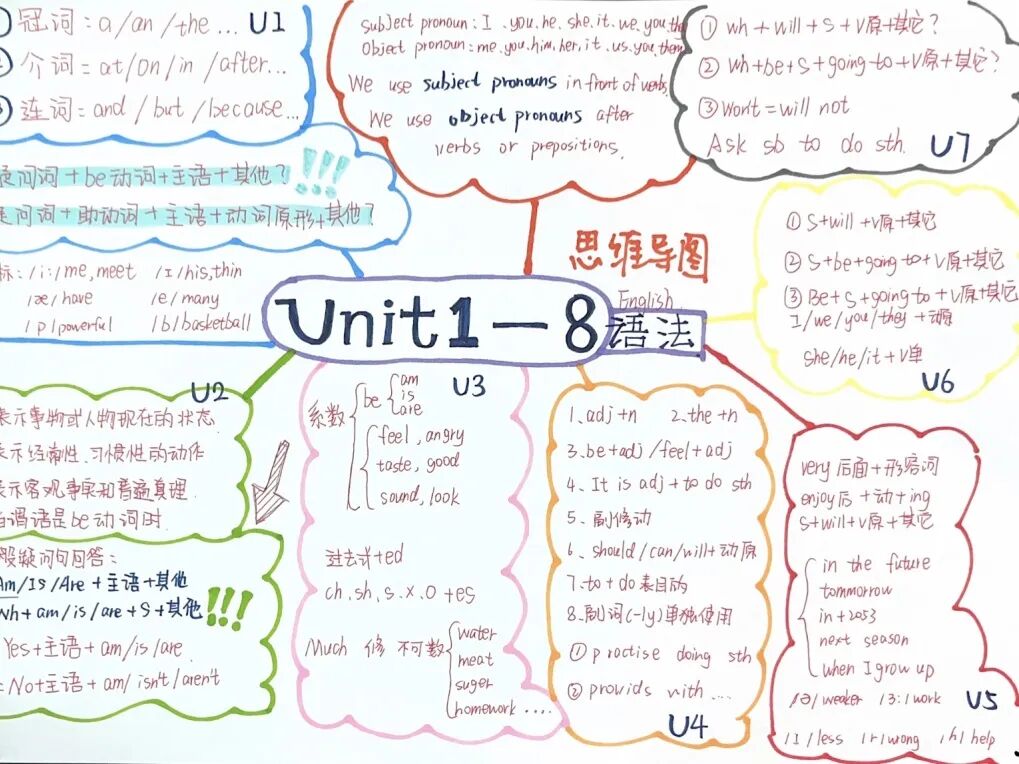 本次思维导图设计活动吸引了众多学生的积极参与,在孩子们的笔下,语法学习不再单调、枯燥,它可以如花朵绽放,也可以妙趣横生。相比于单纯的文字笔记,通过思维导图梳理语法规则,有助于孩子们增强理解和记忆,提升学习效率。